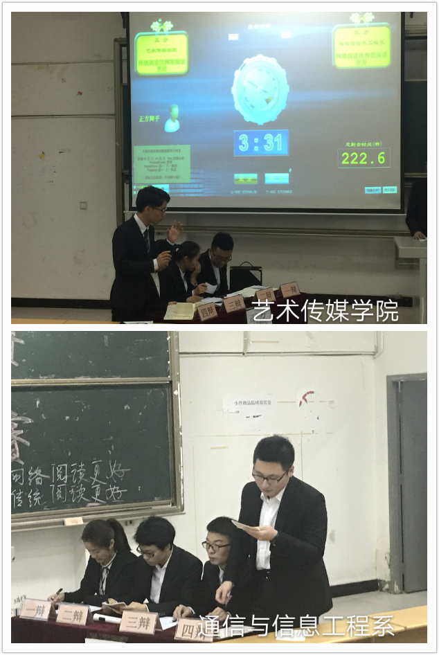 仍然是4月7日在第三教学楼102教室,正方艺术传媒学院和反方通信与信息工程系,以同样的辩题,正方开篇立论道出“传统阅读陶冶人的性情,读书可使人愉悦,可以成为一种乐趣一种享受。”反方的立论道“网络对我们的学习和生活方式的改变是最具有颠覆性的,网上的东西内容丰富,形式多样,我们可以按照兴趣与爱好自由地选择。”等观点。