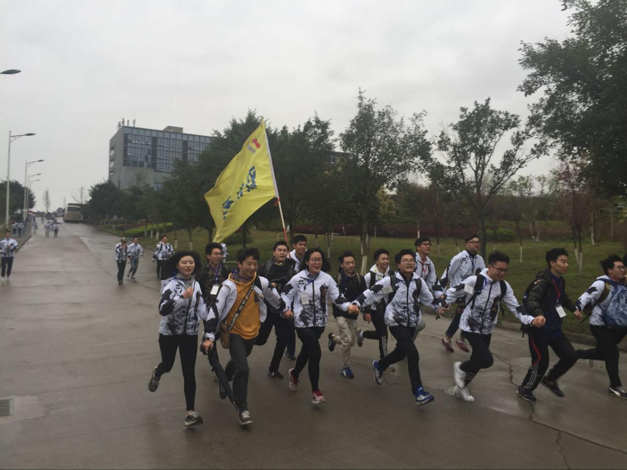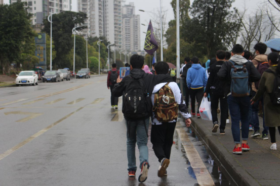 此次活动路线为学校图书馆往返钓鱼城,全程要求学员们负重行走。为保障每位学员的安全,早在活动开始之前,大家就已做好了相应的准备和应急预案。在图书馆集合并合影留念后,大家便高举部旗,一路激昂高歌前行。即便当日风雨交加,也丝毫没有影响大家勇往直前的决心!