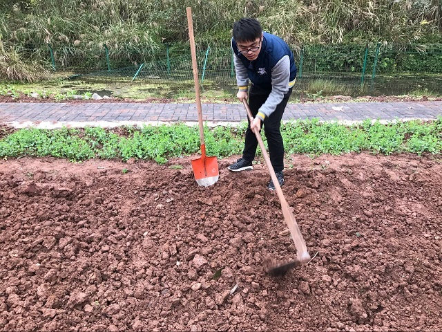 农场劳动工作队在农耕协会学长们的带领下来到了经济性作物种植园。工作队先去领来了农耕的工具,锄头和铁锹在同学们眼里并不常见,但是农耕协会的学长们一一为同学们讲解使用方法和注意事项,同学们更是跃跃欲试。强壮的男同学们主动负责将经济性作物种植园的土地全部翻除、修整和石头清除,而细心的女同学则负责清理里面的小石子和垃圾。