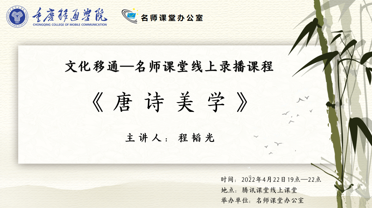 他自称是青莲居士,绣口一吐,便是半个盛唐。他生长在繁华的大唐,有天生我才必有用的宏图之志,却无建功立业的报国之门。他曾隐居山林,纵酒酣歌,也曾挥毫狂饮。他有儒家仁民爱物的善心,也有道家的变化观,骨子里更透出墨家任侠的博爱精神。4月22日晚7点,“名师课堂线上录播课程”播放了中南财经政法大学程韬光老师的《唐诗美学》讲座,跟随程韬光老师我们一起走进“诗仙”——李白的世界。