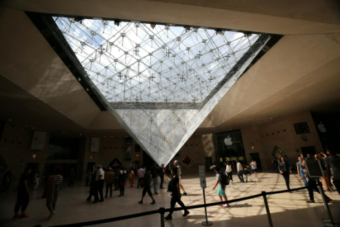 首先我们来到正门入口,透明金字塔伫立于大厅中央,一直连通到顶层地面,这正是华裔建筑师贝聿铭的杰作。
