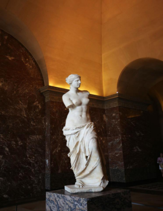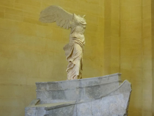 接着来到的是卢浮宫大卢阶梯顶端的平台,有一座船首型基石上面竖立着胜利女神雕像。胜利女神的头和手臂都已丢失,她上身略向前倾,那健壮丰腴、姿态优美的身躯,高高飞扬的硕大羽翼。