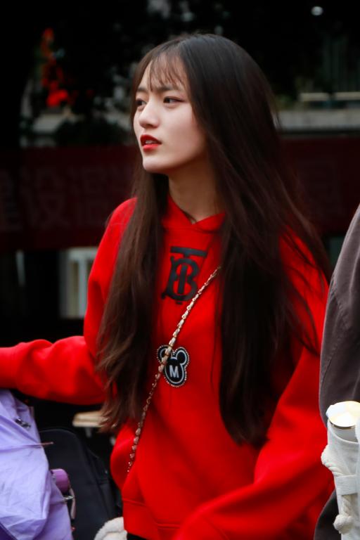 柔顺的长发,高挺的鼻梁,再配上这一身红色卫衣......