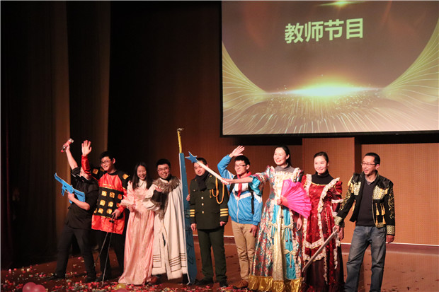 最让人惊喜的是双体系教师们的节目。他们穿上不同的cos装,扮成不同的人物进行走秀。他们故意摆出夸张的造型,引得现场的观众们尖叫连连。就是这样一群教师,他们可爱,他们和蔼,他们敬业。有你们,到哪里都是一片蓝天。