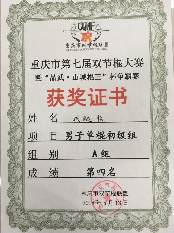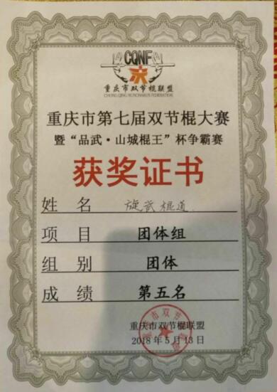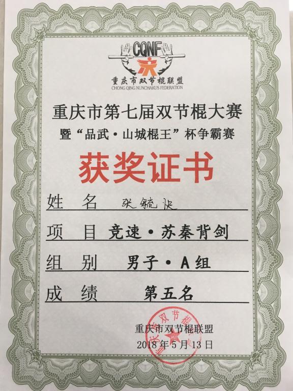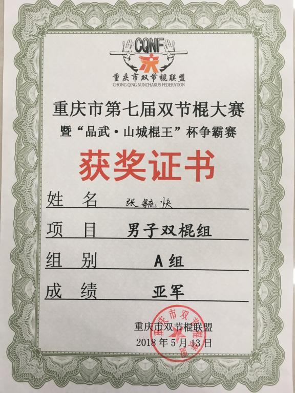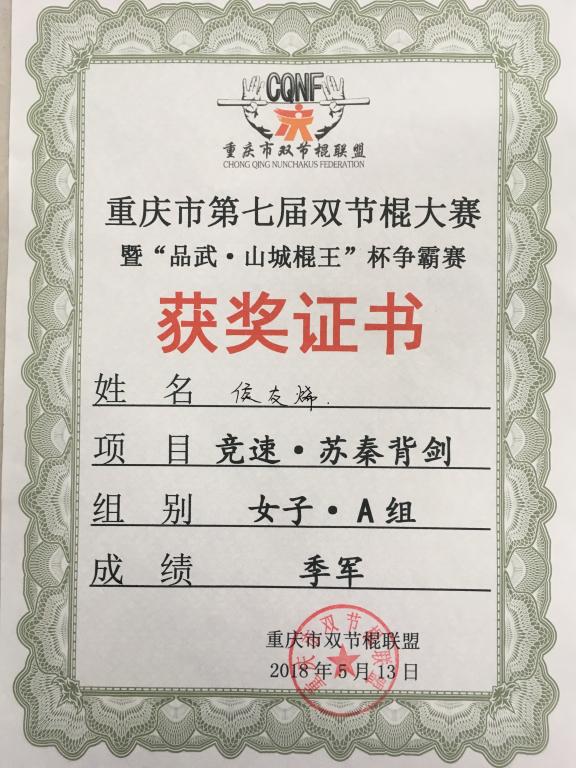 5月13日,我校武道协会在重庆市第七届双截棍大赛中荣获团体组第五名,会员候友烯同学荣获“竟速.苏秦背剑”女子A组季军,会员张毓快同学荣获男子双截棍组二等奖等荣誉。