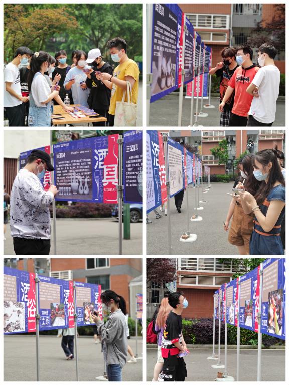何以解忧?唯有杜康。从“上天造酒说”到“杜康造酒说”,至今为止酒文化的起源尚未定论,但我国酒文化从发生、发展、传承积累已有几千年历史。一握琼浆论价值,文化尽在超然中。酒文化知识挑战区域以史为线,一站到底展示我国酒文化的经年积淀,同学们通过酒博会专属体验卡,现场参与酒诗、酒俗、酒具、酒类、酒酿、酒史相关知识挑战,感受从“玉碗盛来琥珀光”到“金樽美酒斗十千”的别样情致;体会彝族“转转酒”是肆意、苗族“拦路酒”的热情和土家族“摔碗酒”的豪气;探知夏朝青铜酒器、三国剽悍酒风、魏晋南北朝的“曲水流觞”、唐宋的“酒催诗兴”以及明清的酒域文化。来自2021级北山书院、外国语学院的蔡育玲同学说到:“日常我所了解到的都是过度饮酒有害健康的负面影响,今天活动现场关于酒文化的千年发展、地域风俗、诗歌情怀等等让我对酒文化有了更加全面和立体的印象,我想‘读书明理、躬耕实践’也是劳动人民经年探索想要传达给我们的文化精神。”