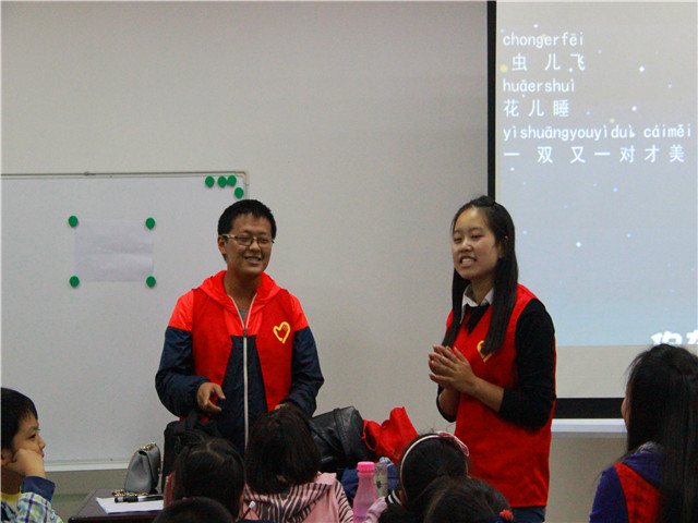 充满童趣的绘画课结束了。但小朋友们意犹未尽,志愿者们也乐此不疲。所以,大家又迅速地进入了第二个课时活动--唱歌。当音乐打开,歌词放在投影仪上时,志愿者们带领着所有小朋友们唱完一首又一首,歌声让小朋友们在繁重的学习之后心情得到了放松,同时志愿者们也跟随着歌声回到纯真,体验了他们的第二次童年。教室里回荡着他们美妙的歌声,教室外飘扬着他们唱动的音符。唱完歌,小朋友就和志愿者们聊天,小朋友们都积极举手,分享着自己喜爱的歌曲。在这教室里的他们,与世无争。这里有画,有歌,有笑声,更有爱。看着小朋友的笑容,志愿者就像自己拿了奖一样。的确,小朋友们的快乐是对志愿者最好的鼔励和肯定,也是最好的回报。