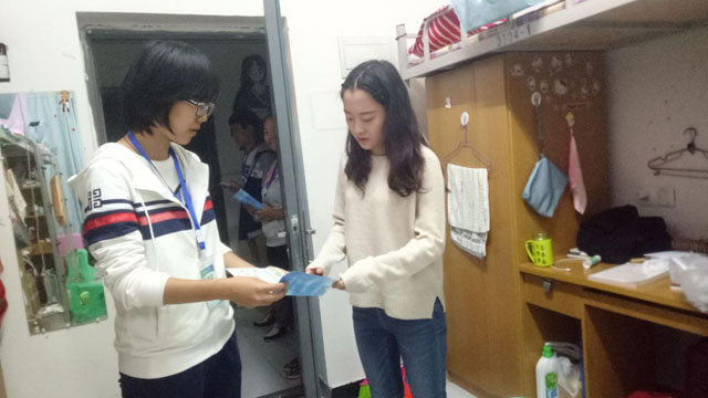 节日前夕,不仅阳光工作室通过线上线下海报宣传,片区楼栋管理联合会的小伙伴们也通过进宿舍发放宣传册和书写板报的形势来呼吁大家参与其中,传递更多的健康正能量。