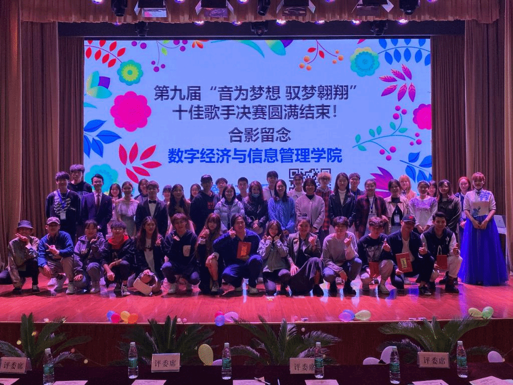 尼采曾说:“如果没有音乐,生活就是一个错误。”可见音乐是生活中重要的调剂。初秋的移通,音乐与校园街景更加相配。秉持着丰富同学们的生活,展现学生个人才艺与风采的初心,我院于10月14日晚19时在下里巴人剧场举行了数字经济与信息管理学院第九届“音为梦想 驭梦翱翔”十佳歌手决赛。本次比赛莅临现场的评委及嘉宾有艺术教育中心指导老师吴娇老师、赵建萍老师,数字经济与信息管理学院副院长任瑞娟老师、数字经济与信息管理学院艺术修养与实践板块指导老师曹文杨老师、爱莲书院发展导师金鑫老师、叶芳老师,校园社团活动板块指导老师彭薇薇老师、志愿服务板块指导老师马莉老师以及就业指导老师王冰倩老师。