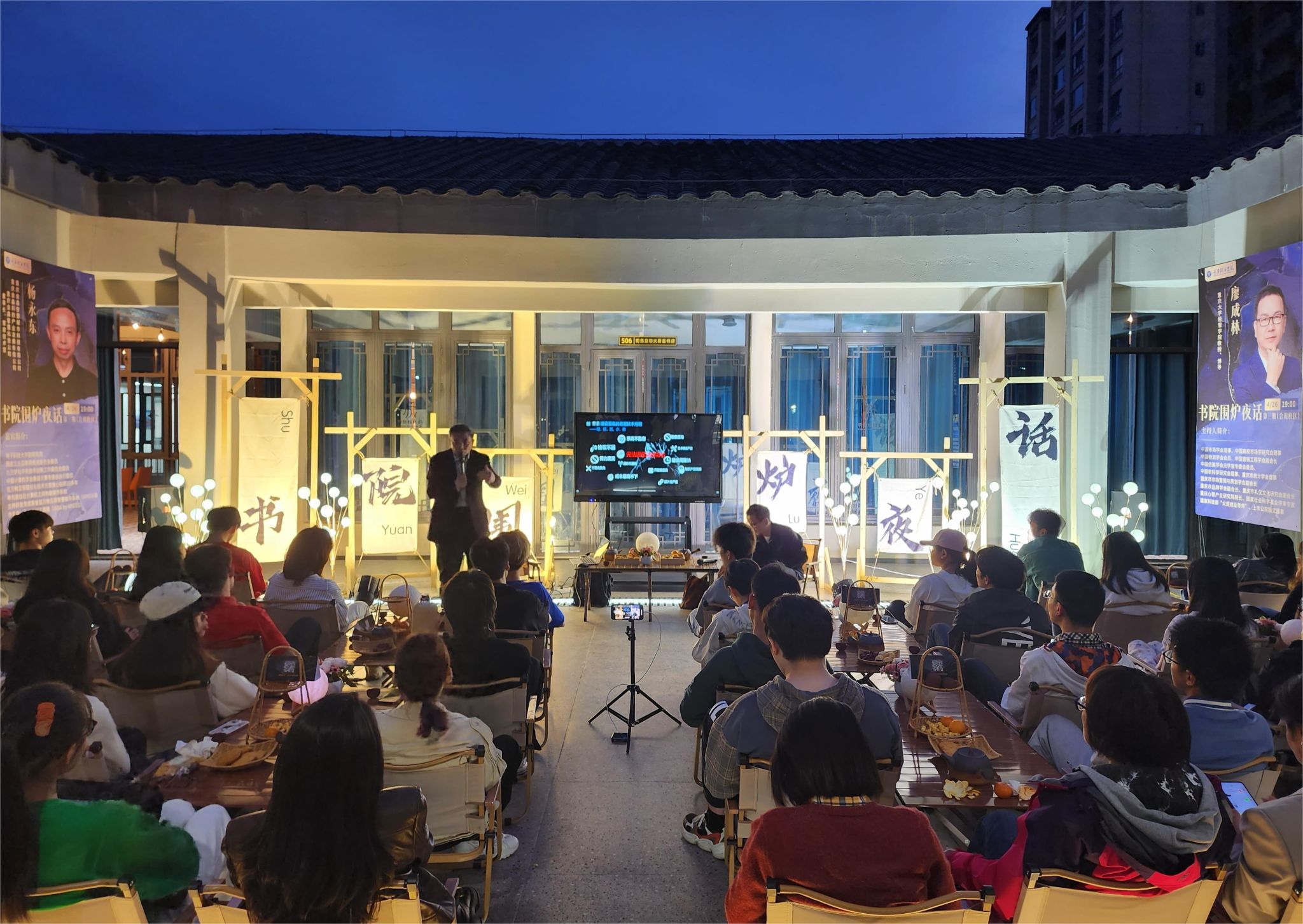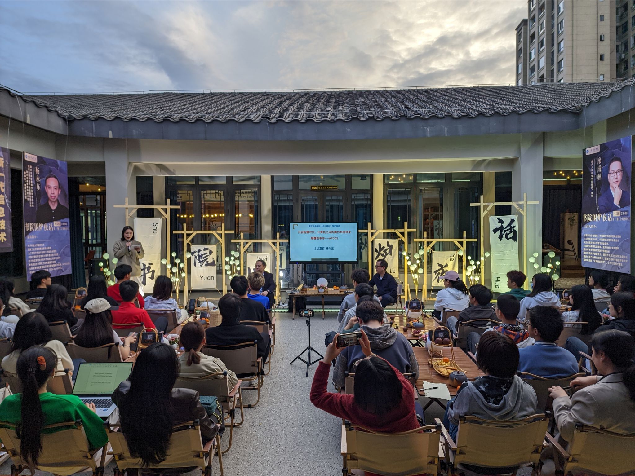 为进一步落实学校“信息产业商学院”办学定位,积极探索创新科学育人举措,为学生提供终身受益的教育体验。由教务处、书院部主办,别都书院承办的“书院围炉夜话”合川校区第三期活动于4月26日19:00在天空书院五楼陀思妥耶夫斯基书店顺利开展。活动特邀重庆金鑫智慧城市科技有限公司、重庆金鑫智慧科技公司、重庆金鑫科技产业发展有限公司董事长、首席技术官、高级工程师杨永东为主讲嘉宾,新商科教育集团商科教育委员会主任、重庆大学经济与工商管理学院博士生导师廖成林教授担任主持,两位嘉宾与50余名师生四方围坐,同堂热议,沉浸式感受智能化软件技术、智慧产业发展和不同协议产品间的互联互通,一同体验智慧生活的未来。