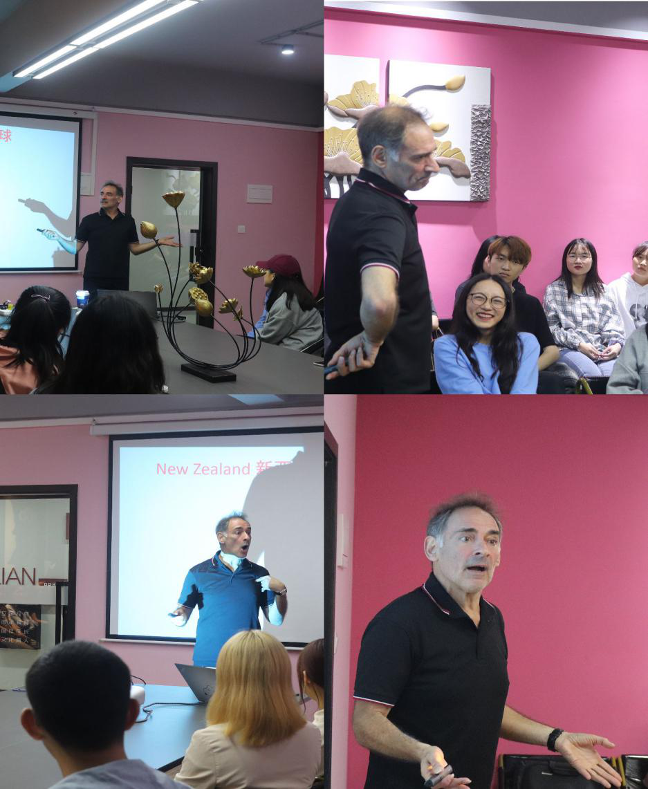 首先,Clive简单介绍了自己的家庭和成长的经历,让在座的小伙伴们更加了解了经常活跃在校园里的Clive老师。接下来,Clive从自己的故乡英国伦敦出发,配合着自己的照片,声情并茂地讲述着自己的生活经历。从康河柔波里的剑桥到舒适惬意的英伦生活,从他酷爱的英国本土运动板球到布莱顿海滩的日光浴,从岁月静好的新西兰再到“神奇”的中国,Clive的讲述让我们身临其境地感受着他一路走来的生活故事。