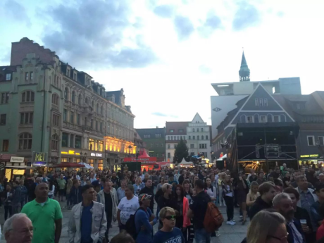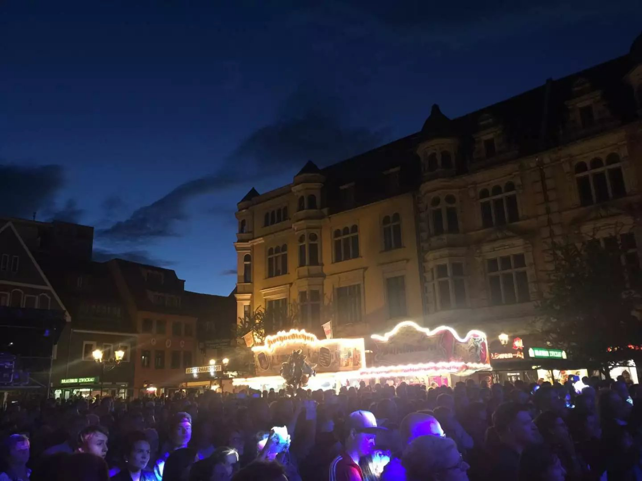 最后我们跟随着人群来到了市政厅广场的正舞台,然后找了一家露天酒吧喝着啤酒,欣赏着舞台演员为我们带来的所有激情欢乐。此时的我很想将时间永远的停留在这一刻,停留在德国、停留在茨维考、停留在这最美好的音乐节。德国人的热情让我感到了意外,德国的音乐文化让我感到了亲切。我们没有选择继续跟随人群去狂欢,因为我们想保留住脑海中那最后一丝的想象。有的时候,最美好的东西不是将它全部体会、全部得到,留有一丝最后的悬念和空间,会有一种让人难以捉摸的神秘感和梦幻感。
