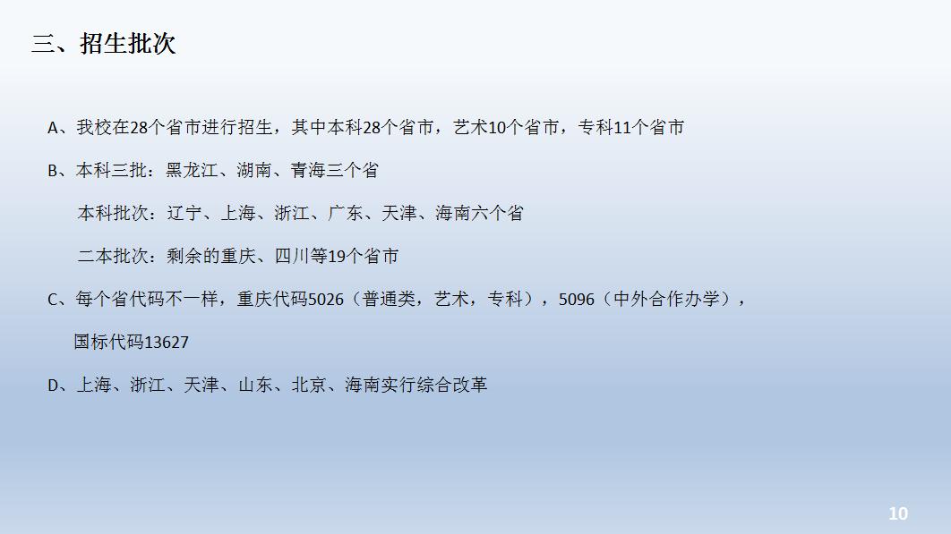 重庆邮电大学移通学院致力于培养未来经营管理的中坚力量,采用创新的教育模式,其中包括四位一体的培养模式:商科教育+完满教育+通识教育+专业教育;双院制:学习在学院,生活在书院;特色教育:远景学院、创意写作中心、国际商学院、科幻中心、拓展训练、文化移通和双体系等等。张成川老师也从招生类别、招生批次、招生专业、计划分布、数说移通以及荣誉称号等方面进行了详细介绍,让其他老师更进一步了解学校,一方面增强对学校的理解和认同,另一方面也能更好地指导同学们的广告创意设计作品。