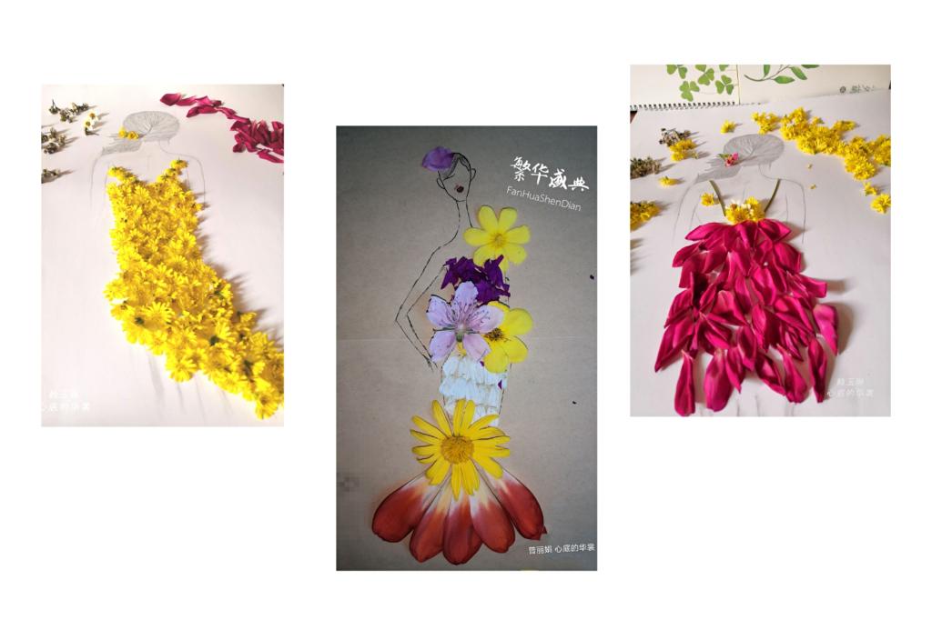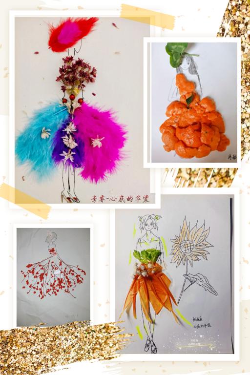 “心底的华裳”板块是指同学们在纸上勾勒除人物轮廓,并用家中的各式元素打造一件自己的华裳。在这一板块中,大家充分地发挥了自己的想象力和艺术细胞,设计了一件件或精致、或可爱的小衣服。有的用花瓣,有的用水果皮,还有的用羽毛做出美丽的裙子。来自花果书院的赖玉琳同学,她自己动手做了两个作品,其中一个是便是她用花瓣和画笔设计出来的美丽华裳。赖同学先用画笔勾勒出一个少女的背影,然后用玫瑰花瓣和菊花的花瓣当作她的裙摆,用花根当作她裙子的吊带粘在画纸上,让画中少女跃然纸上。同学们的作品件件别致,样样精美,也都是他们心底对美丽的诠释。
