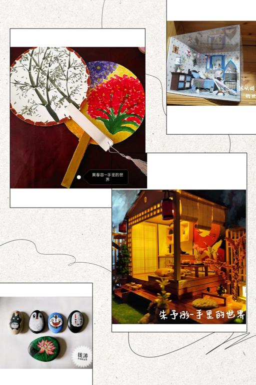 而在“手里的世界”这一板块则需要同学们发挥创造力,利用身边的元素做一件“工艺品”。这样独具“工匠气质”的手工活动吸引力大批量的男生参加,他们在此次活动中,拾起了童年的回忆,有的用纸片折叠出各式各样的小物品。有的同学用黏土做了一个“孔雀”,有的同学施展自己的绘画天赋,在小石头上画卡通人物。来自鱼城书院的朱予彤同学,她的作品是一个DIY小房间,房间里的每一样装饰品,无一不体现出她的细心。这个巧夺天工的小房间就像是她内心的一个小世界,简洁而美好。大家的作品囊括了各个方面,既好看又有趣,看了让人只想感慨一句“高手在民间”啊!