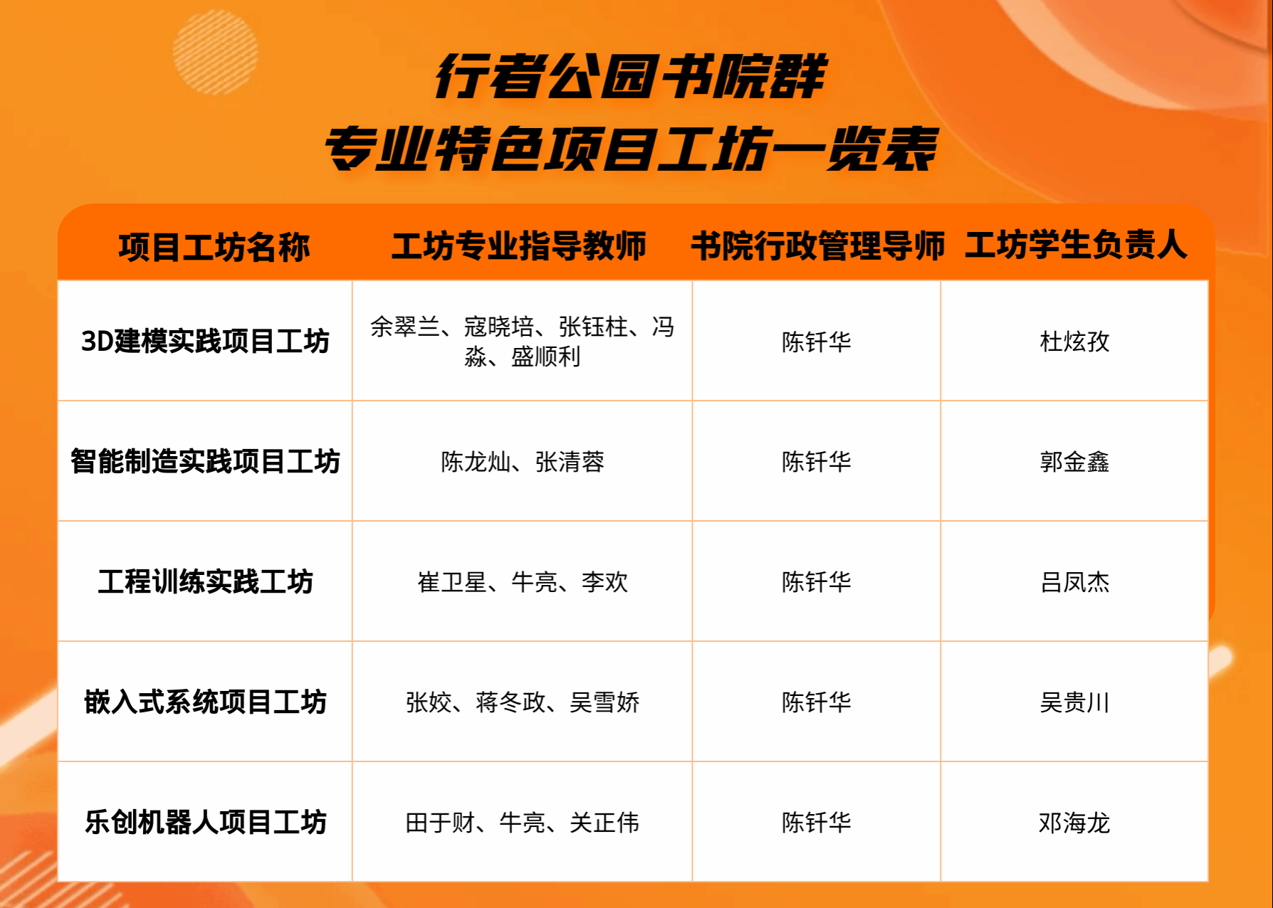 合抱之木,生于毫末;九层之台,起于累土。未来的日子里,行者公园书院群将持续立足专业集中式书院的定位和“培养智能时代的新型工程师”这一育人愿景,按照既定的目标和规划,继续不断完善和丰富5个项目工坊的运行机制和管理模式,落实书院育人的载体功能,与智能工程学院继续打好协同育人的“融合拳”,更好地服务书院群学子成长成才。