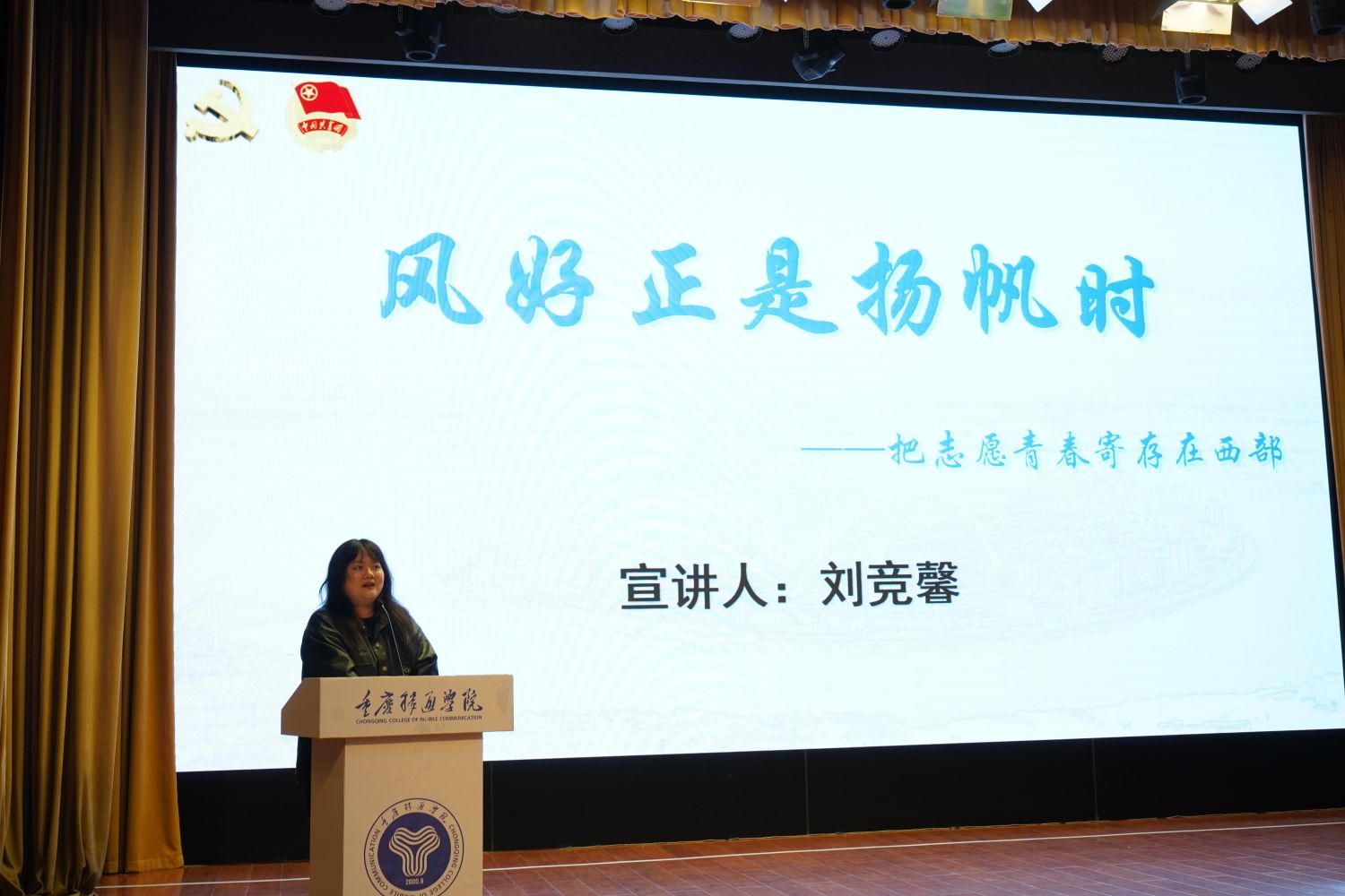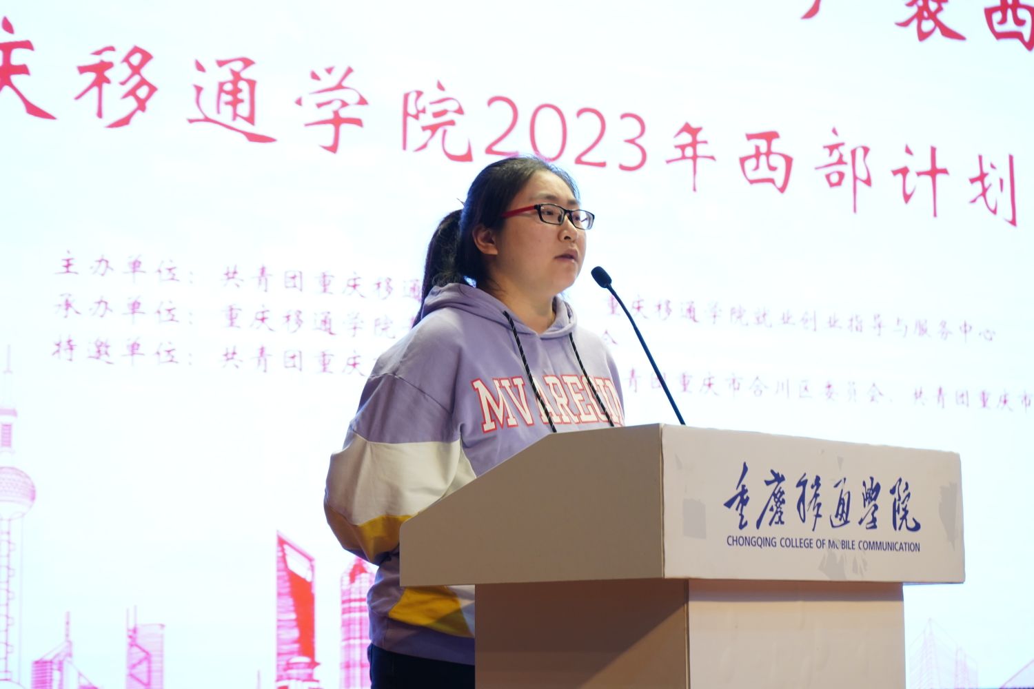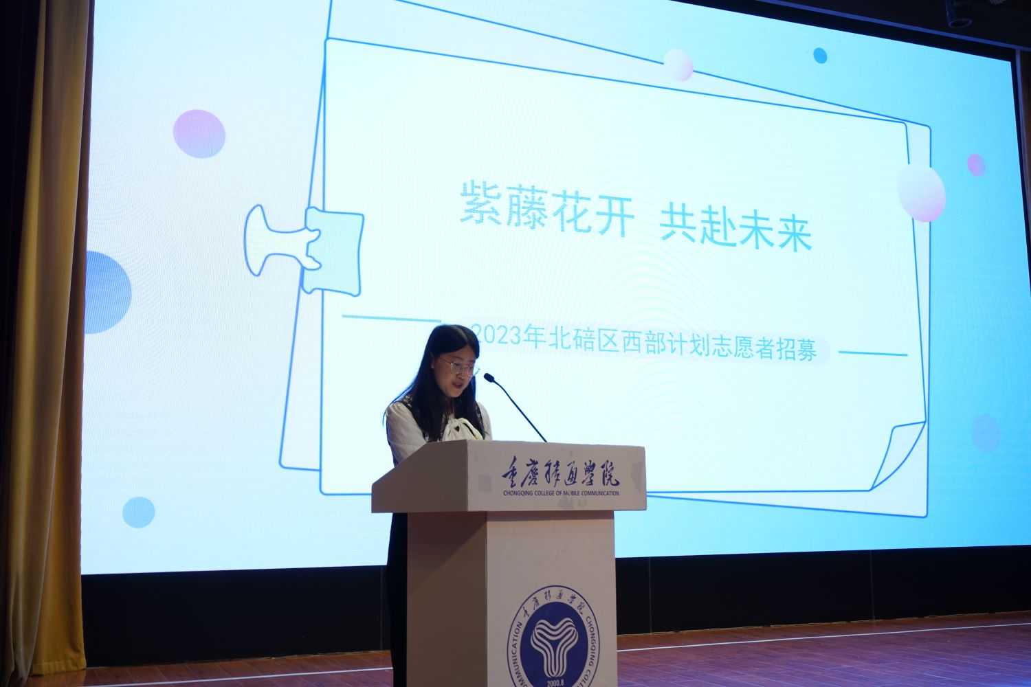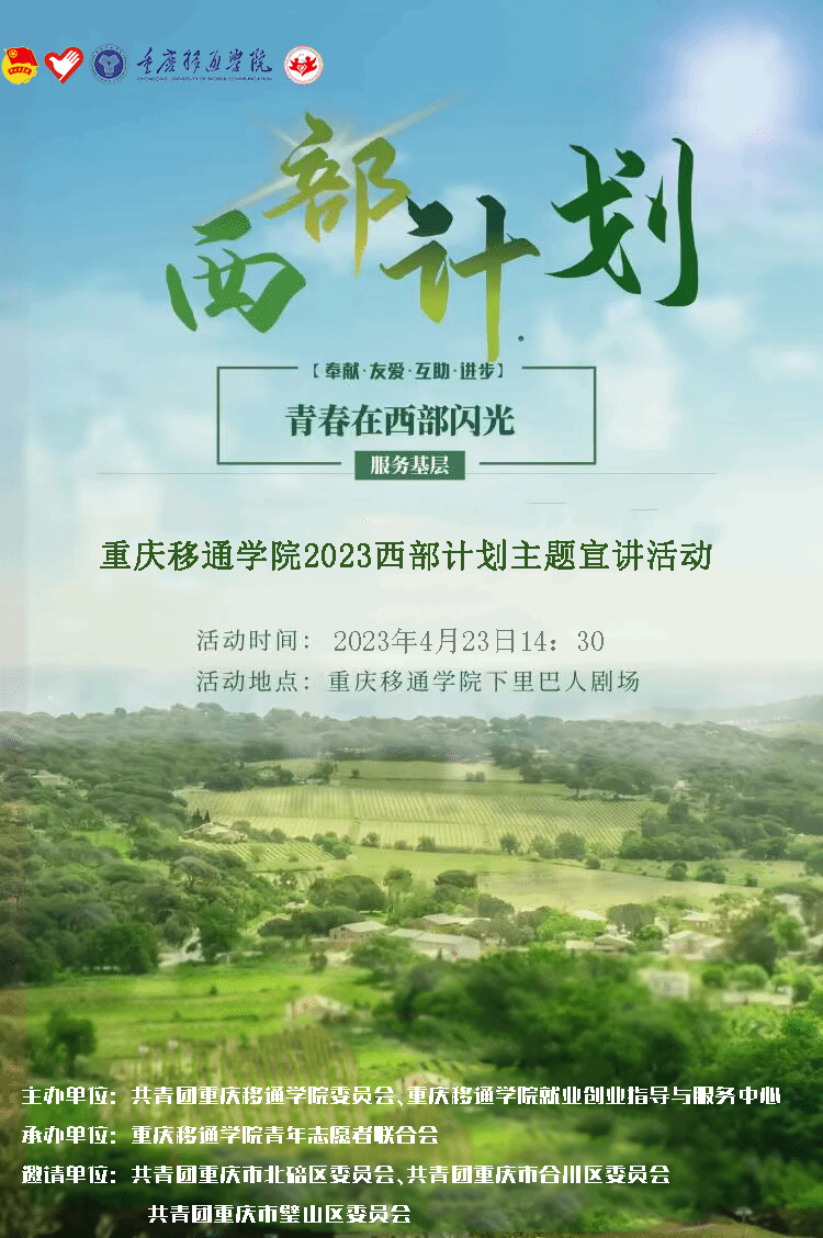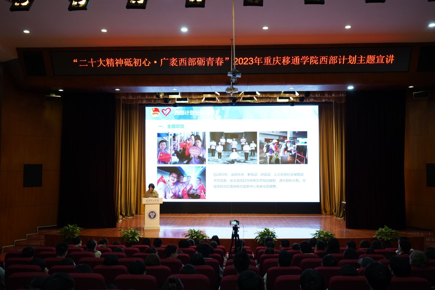 为了深入学习贯彻党的二十大精神,号召移通学子积极响应志愿服务西部计划,进一步扩大西部计划项目在我校的宣传度和影响力,促进我校毕业生及在校生全方位了解西部计划,踊跃投身西部建设。4月23日,由校团委牵头,邀请重庆市合川区、北碚区、璧山区西部计划项目办代表走进重庆移通学院,并于下里巴人剧场开展了“二十大精神砥初心·广袤西部砺青春”2023年重庆移通学院西部计划主题宣讲活动。该活动通过“线上、线下”双线开展,特邀到重庆移通学院校团委书记谢银平、就业创业指导与服务中心主任佘桂隆、北碚区西部计划项目办负责同志周飞鸿、合川区西部计划项目办负责同志李红侠、璧山区西部计划项目办负责同志陈家鑫,以及各学院学工副院长、团总支书记、志愿服务板块指导老师、各毕业班辅导员、各学院2023年毕业生代表、服务县西部计划项目办在岗优秀志愿者代表,共计800余人参与其中。