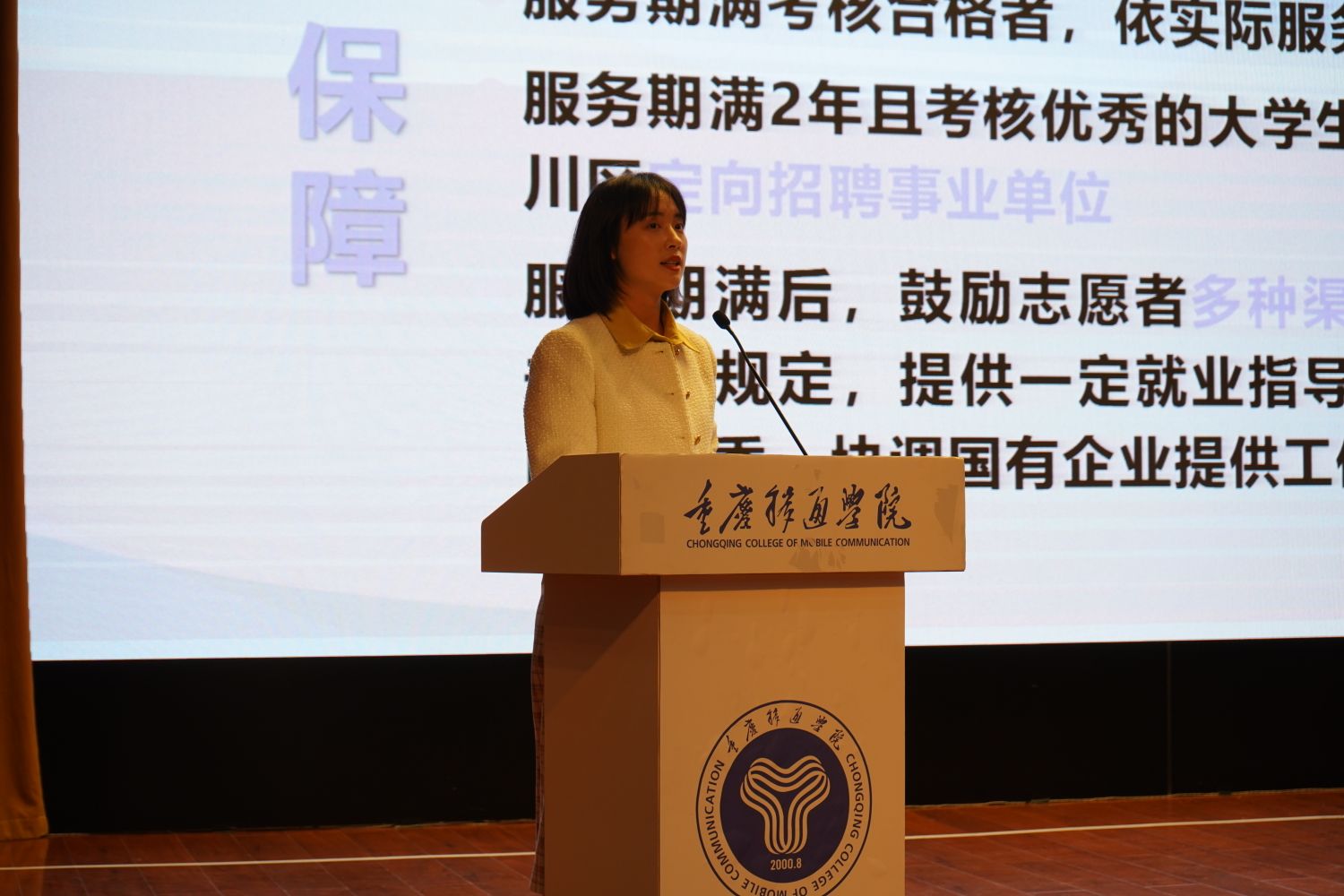 随后,3个服务县项目办负责同志结合自己服务县西部计划项目办的特色亮点,通过视频、PPT讲解的形式向同学们展示出不同服务县的优势,并针对同学们关心的考研考公优惠政策、经费保障、福利待遇、工龄计算、服务期满后就业择业等问题进行了讲解。