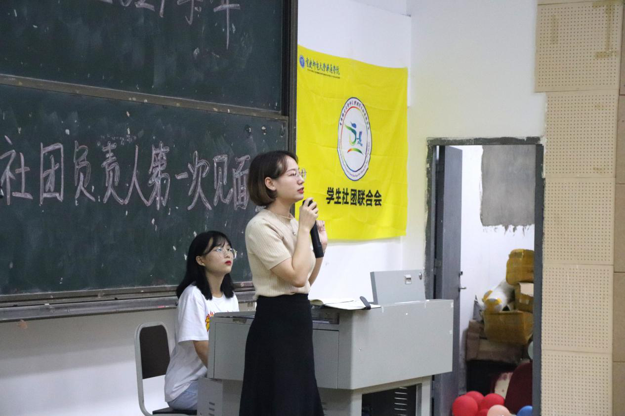 最后,校团委黄杜娟老师向参会人员介绍了我校学生社团的发展历程,回顾上一学年学生社团的收获与成长,对过往的工作作出了肯定,特别指出社团改革有进展,平台衔接有突破,校外获奖有分量,社团联盟有声音这四大方面的进步。同时对2020-2021学年学生社团提出了新的要求与希望,希望各学生社团不断推进社团管理,注重社团纪律,注重学生社团活力提升和品牌推广,加强社团联盟的合作与发展。为增强社团负责人的综合能力,学生社团联合会将定期开展培训,完善评优激励体制,更好的服务管理学生社团。黄杜娟老师最后表示:代表学校感谢社团同学们的辛苦付出,社团是凝聚奋斗,培养兴趣爱好,培养和传承大学精神的主要载体,为同学们拓宽视野,锻炼能力,施展才华搭建了平台,所以学校也很重视并且正在努力为同学们的社团活动营造更为规范,有序,健康的发展环境。