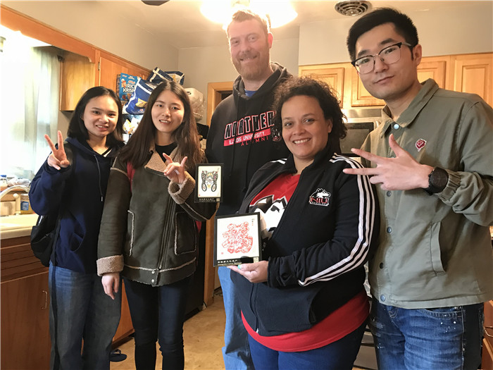 欢乐的时光总是短暂的,在畅谈玩耍过后,我们回到sullivan的家里,给了我们从中国带来的剪纸,他们还给我们展示了一些小礼物,没想到他们还留着之前来交流的学生带来的礼物,有辣条、火锅底料、陈麻花等等,让我们教他们如何食用,我们也提醒他们有的已经过期了不可以再吃了。从中可以看出来他们对中国的喜爱之情。他们也多次和我们说,以后有机会,一定一家人一起去中国旅行,我们也期待那一天,希望下次可以在中国相聚。