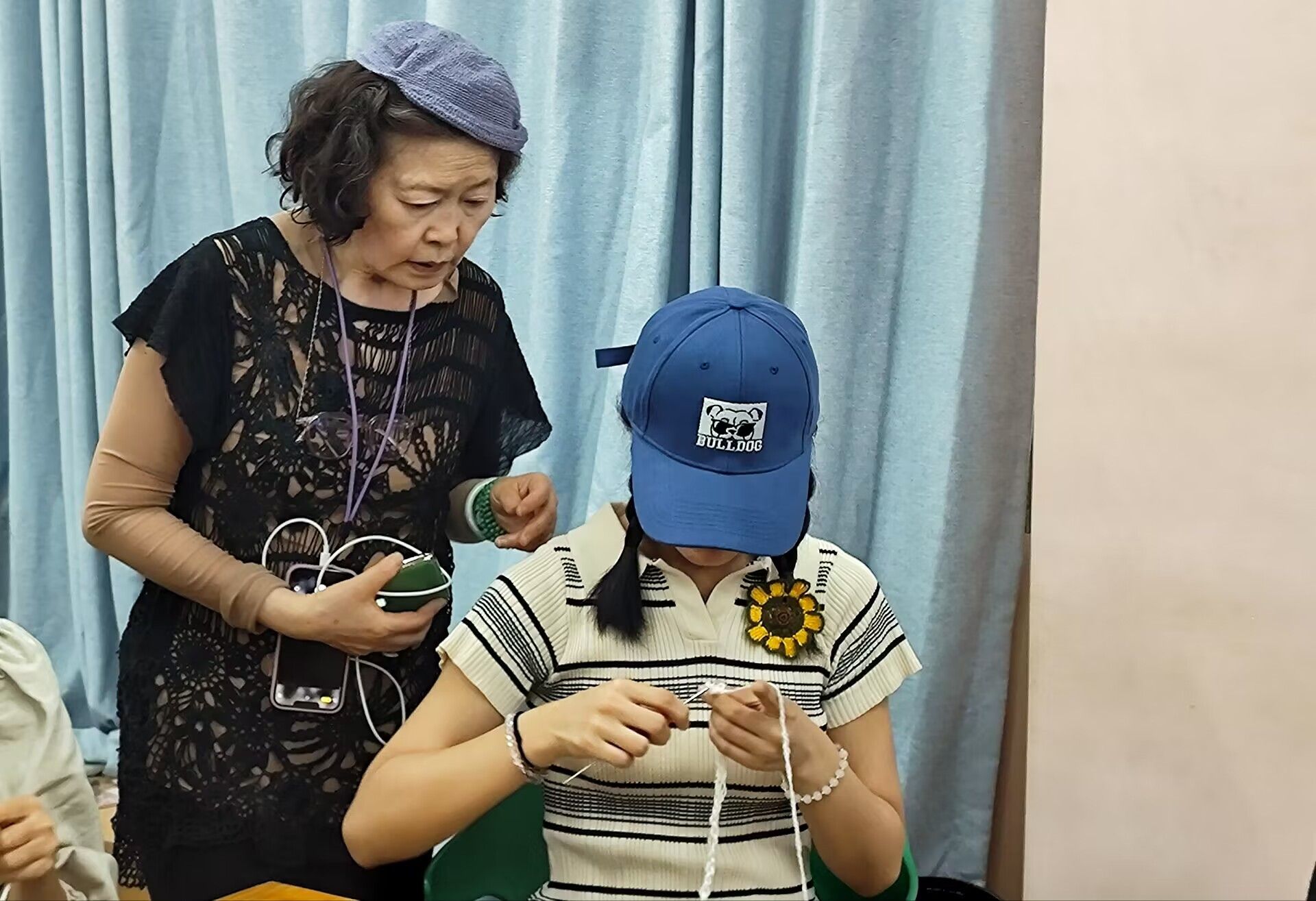 刘一华老师先对手钩编织进行简单介绍,播放已提前录制好的教程视频,参与者观看、学习,感受着织着在一针一线中付出的心血与热爱。