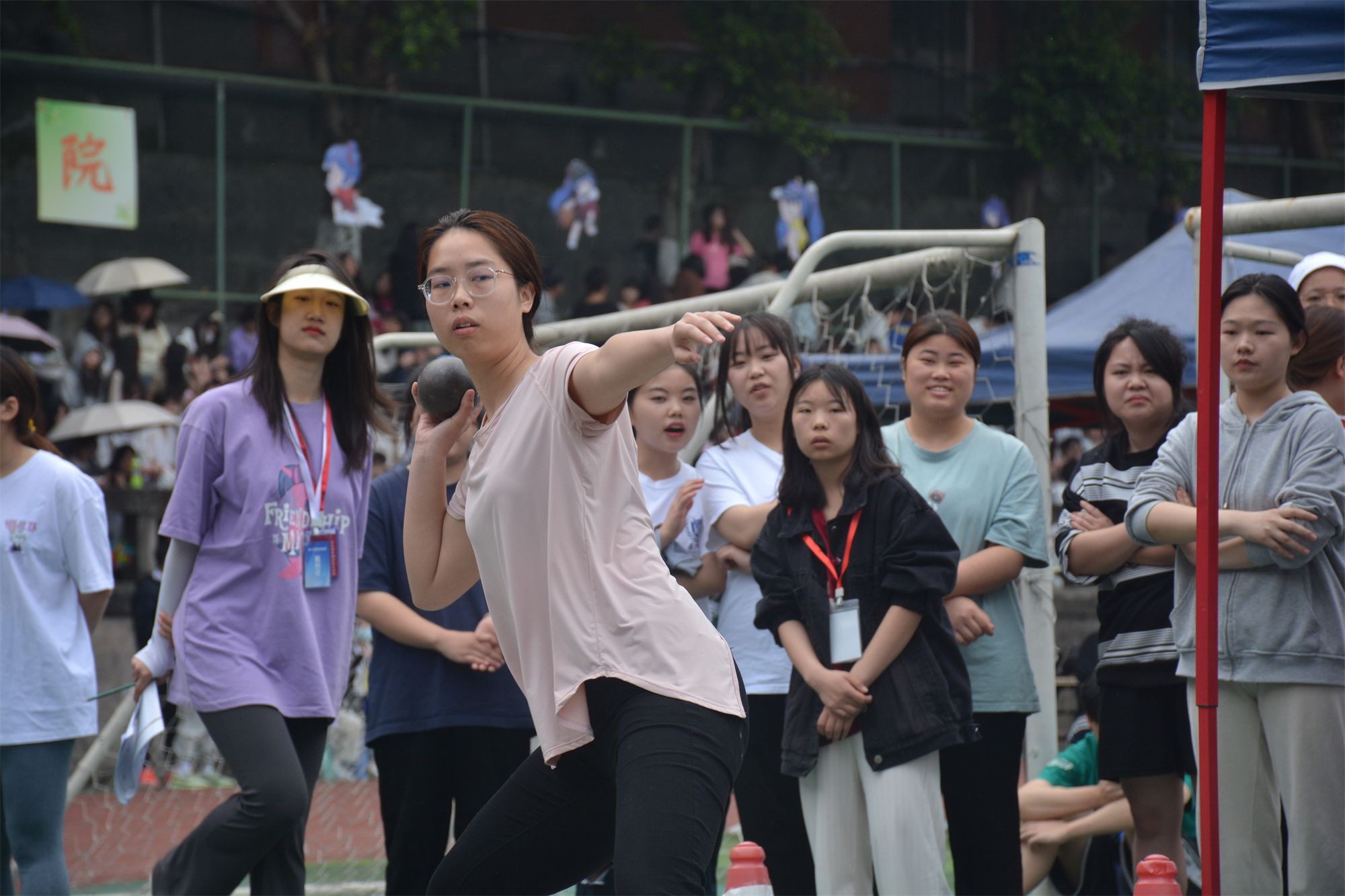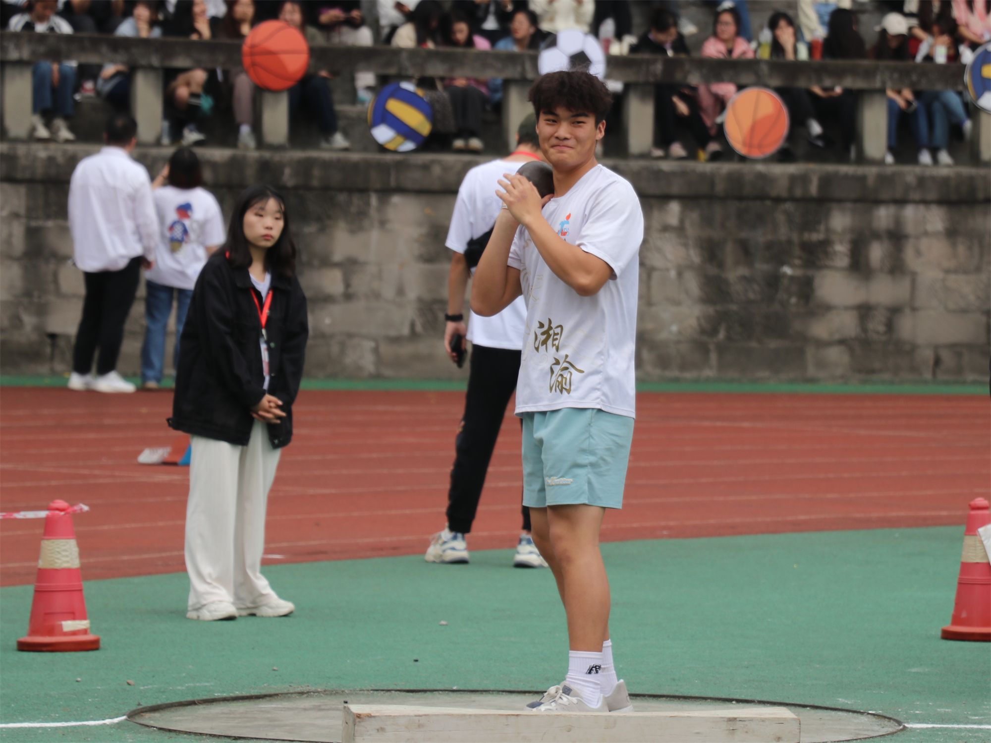 在不远处,铅球比赛正如火如荼地进行,一颗颗铅球在空中划出优美的抛物线,最终落在沙坑中,留下选手们奋战的痕迹与荣誉的证明。最终,我院牟瑞、邓健、康蕊分别取得男子铅球第一名、第六名、第七名的优异成绩,付跃与黄才华取得女子组第三名与第五名的优异成绩。