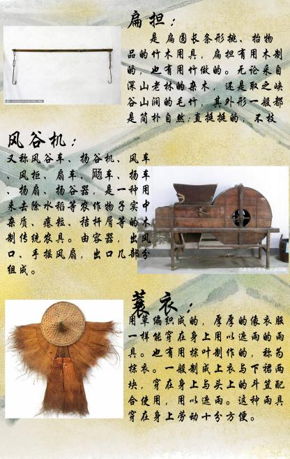 农具的使用开拓了田地,让人类世代在这片土地上安居乐业,随着农业现代化的发展,越来越多的传统农具被机械产品取代,播种机、收割机等农业机械因为高效、省工、省力而逐渐替代了传统农具。传统农具的消失逐渐成为了社会发展的必然趋势,但是它们在几千年的农业发展中立下过不朽的功勋,也是历史传承和时代进步的伟大见证者。