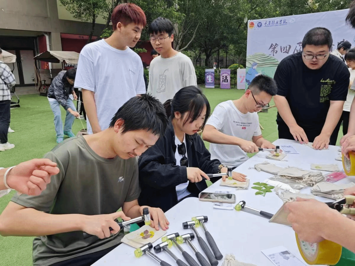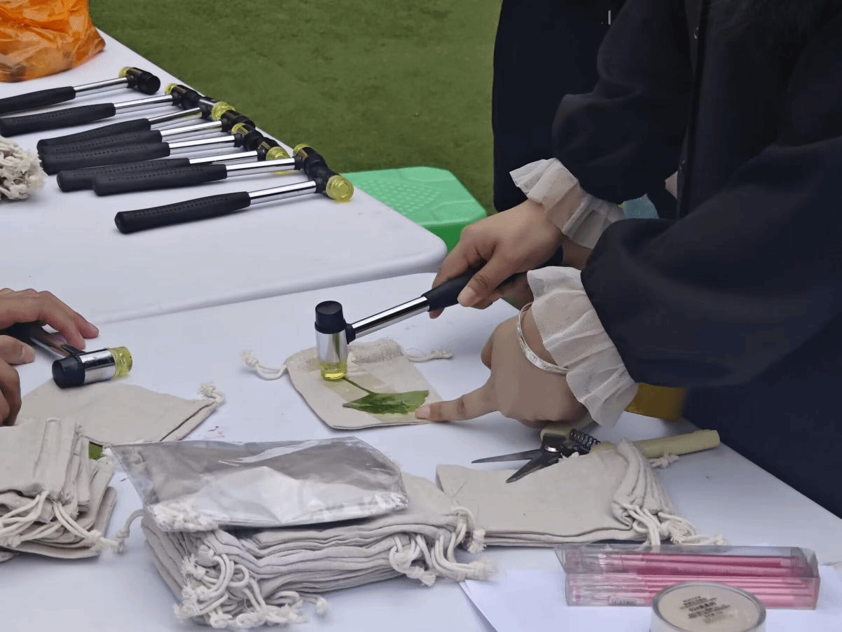 发现植物的更多可能,DIY社团用一场拓印活动,探求到了更多灵动方式,让生命得以延续,时光得以留存。长桌上,大家开启了这一场敲敲打打的艺术。挑选,固色,布局,敲打,将花草的汁液拓在帆布袋上。在跳跃的金辉下,一点一点地创作,慢慢制作出心里的世界,温暖一日的寻常时光。敲打完成后,轻轻揭开叶片,欣赏植物汁水在白色棉布上,留下或清晰或斑驳的印记。哪怕是同样的树叶,经过不同小伙伴的敲打也能呈现出不一样的图案,很“原始”,却美得“独一无二”。“植物拓印”是大家对自然的一场深入探求,没有模板,自由发挥,分享整个寻觅的过程,分享敲打中感受到的情绪,留下了灵魂与万物的共鸣。