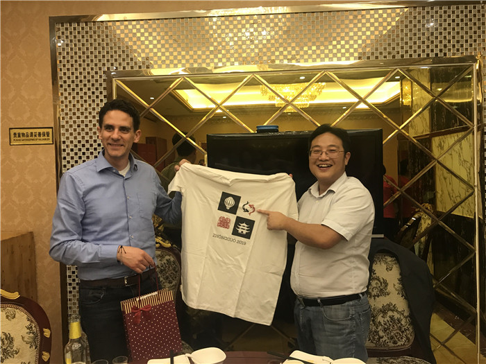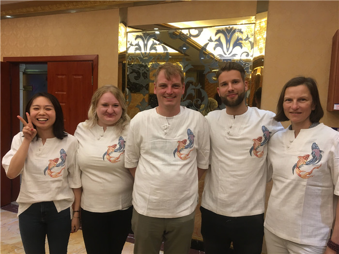 晚宴结束后,中德双方互赠文化衫作为礼物,德方的文化衫上带有许多中国元素的图片,表达了他们对中国的向往之情。中方的文化衫上带有精致的刺绣和盘扣,尹浩亮院长也细心地解释了中方文化衫的含义。德国嘉宾们十分喜爱中方赠送的礼物,他们当场换上文化衫,纷纷拿出手机、相机拍照留念。尹浩亮院长还特地叮嘱负责此次活动的2位国际处带队教师,要加强沟通、做好后勤服务,保障学生们的安全,圆满完成此次的文化之旅。