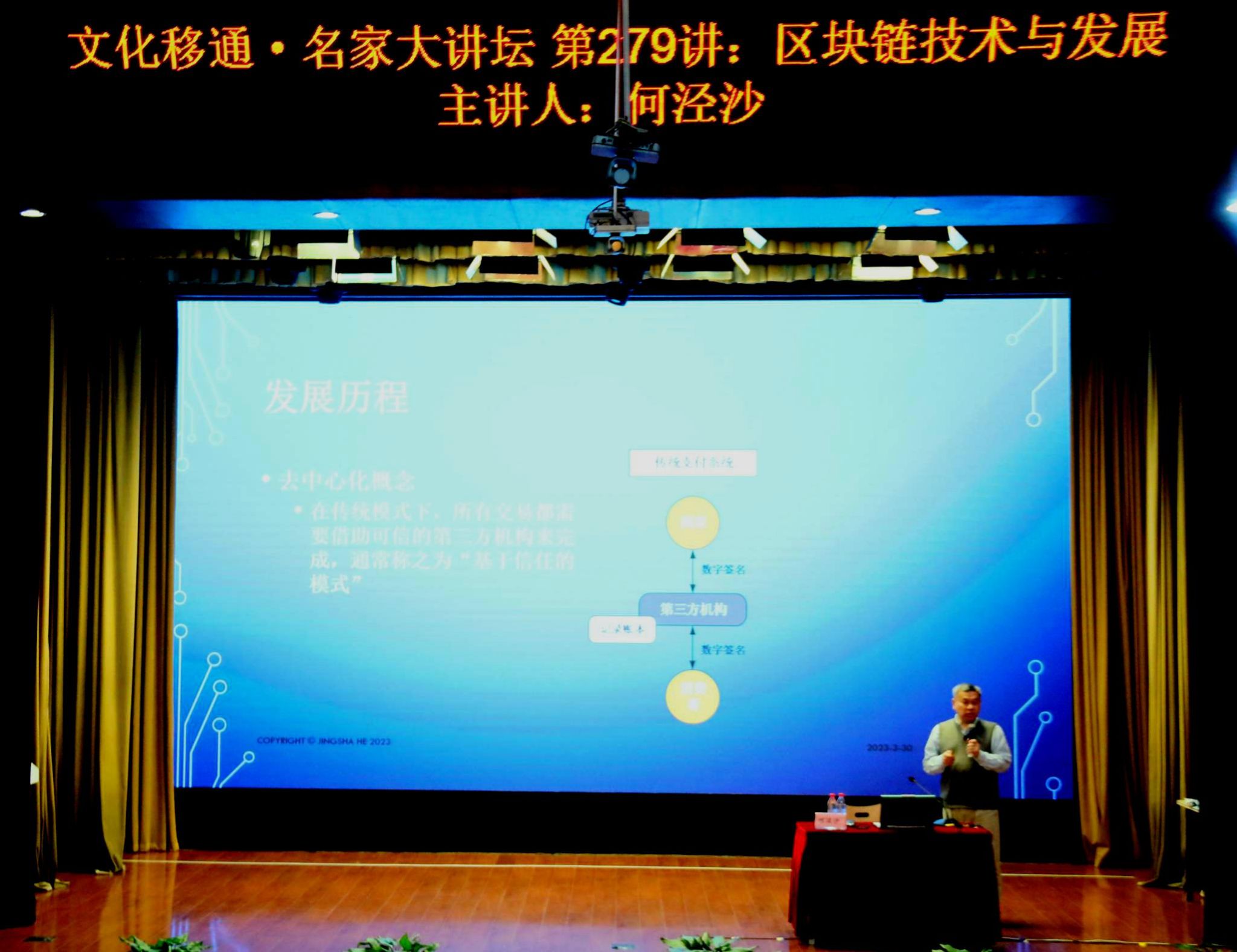文字的发明标志着知识的传承,信息的流通和发展促进着人类社会的进步。货币的产生代表着价值体系和信用体系的建立,价值的传递促进了 商品的流通,也就标志着物质的不断丰富,区块链就在此背景下产生。3月30号晚上七点,何泾沙教授在下里巴人剧场为同学们带来了主题为《区块链技术与发展》的讲座,让同学们深入了解当代区块链技术发展。