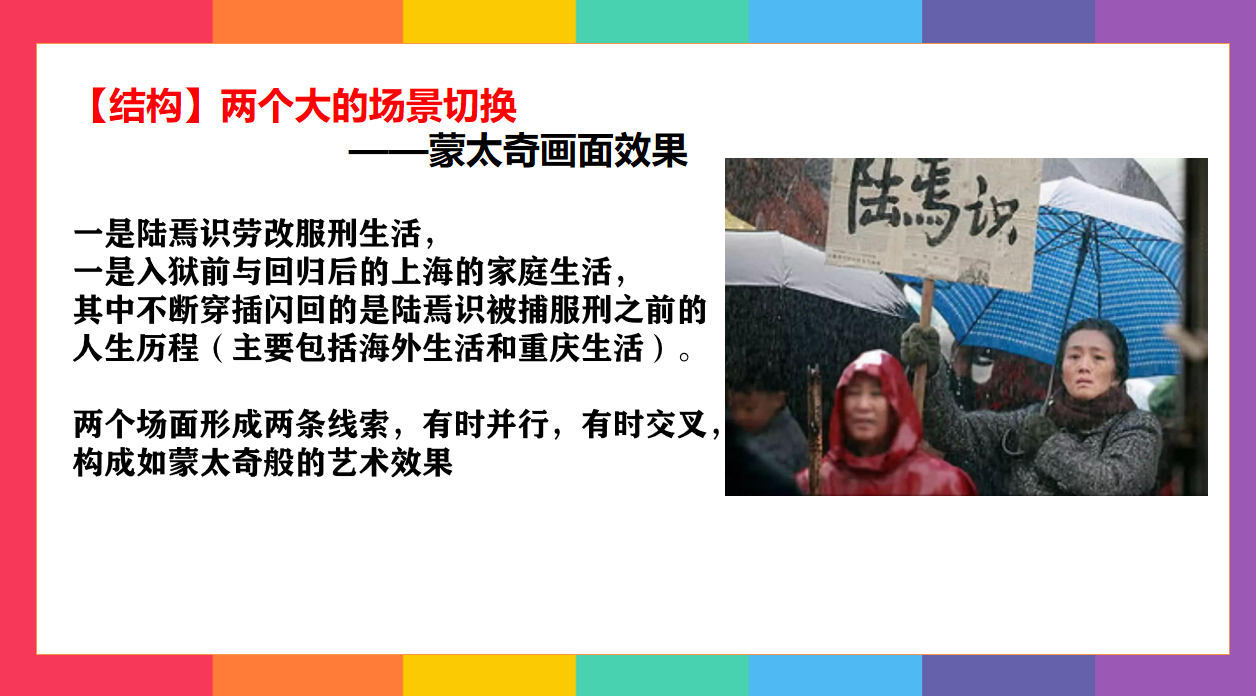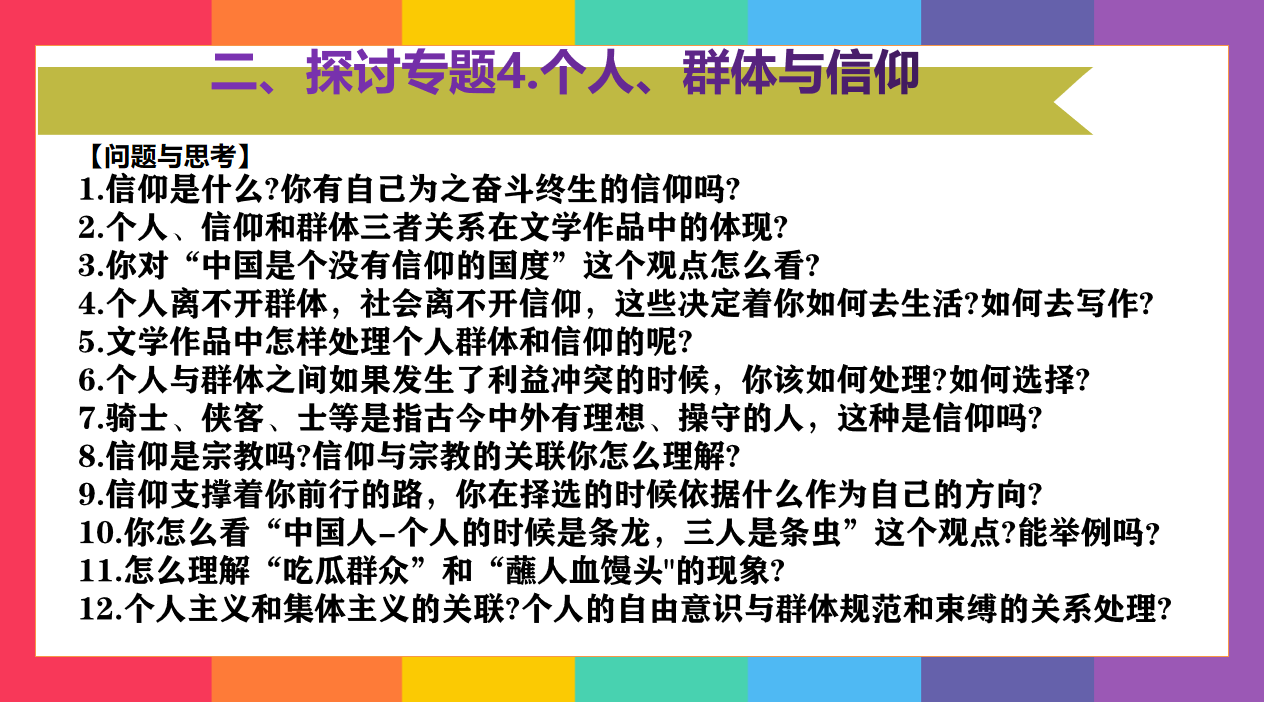 毕老师抛出十二个问题思考,然后为我们以概括的形式将个体,群体与信仰作了一个特殊的讲解,便是自《陆犯焉识》这一部小说来展开。从小说的大致内容与个体群体的关联。其中更加值得我们学习的更有蒙太奇式的场景切换。个人自由与群体的关联即命运以这种方式于读者面前鲜活的展现。