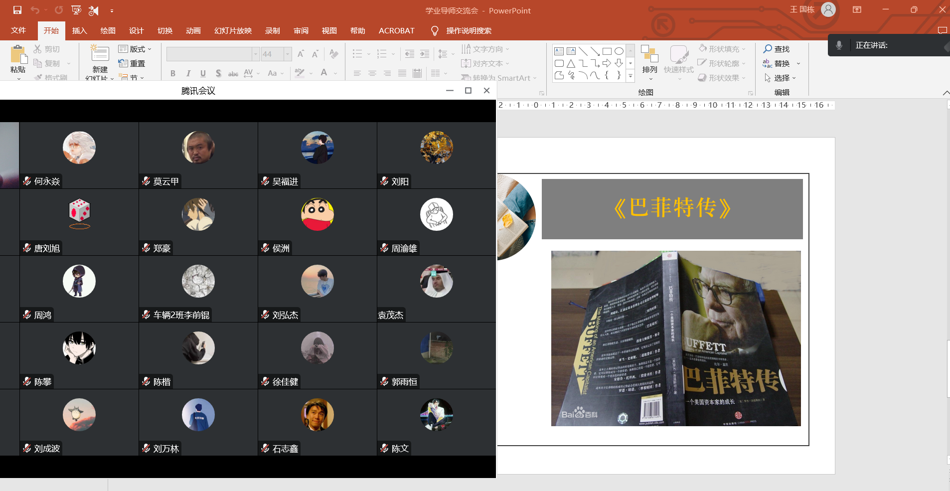 本次学业指导围绕所带班级所选的《思考 快与慢》《巴菲特传》《崛起的智慧》《褚时健传》《创始人手记》展开,特别是在后疫情时代让同学们学习到乐观面对生活苦难,无论生活顺境逆境,做人、做事都高标准、严要求,抓住事物重点、规律,并且以认真、精益求精态度,更好地认识自己的思维方式,提高自己的决策能力,成为一个真正有能力,更加全面的优秀大学生。