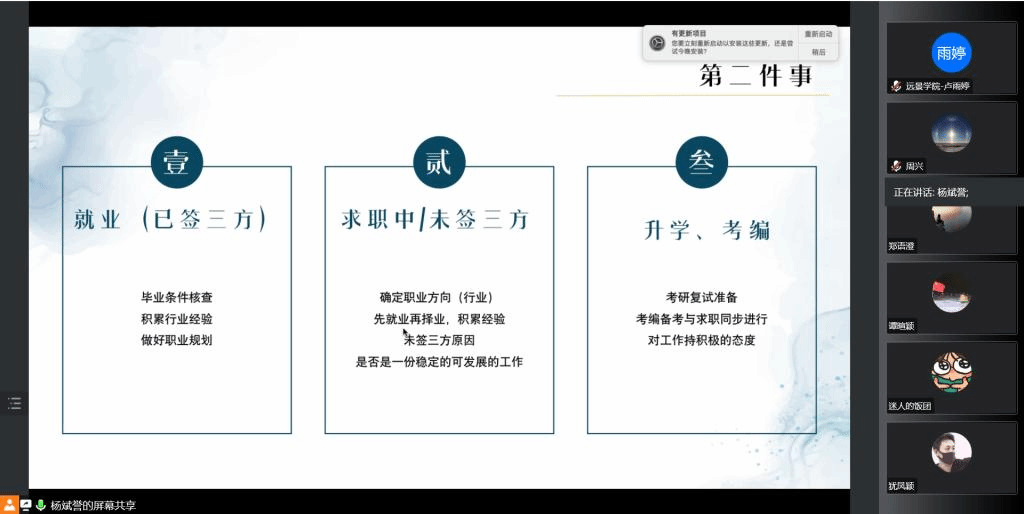 截止2023年3月15日,远景学院2019级召开多次线上年级会,指导和动员2023届毕业生就业,辅导员杨斌誉及2019级全体学生参加。会上,辅导员分析目前年级就业状况,讨论各个就业阶段同学的情况,根据同学们不同需求着重讲解应侧重的就业指导。