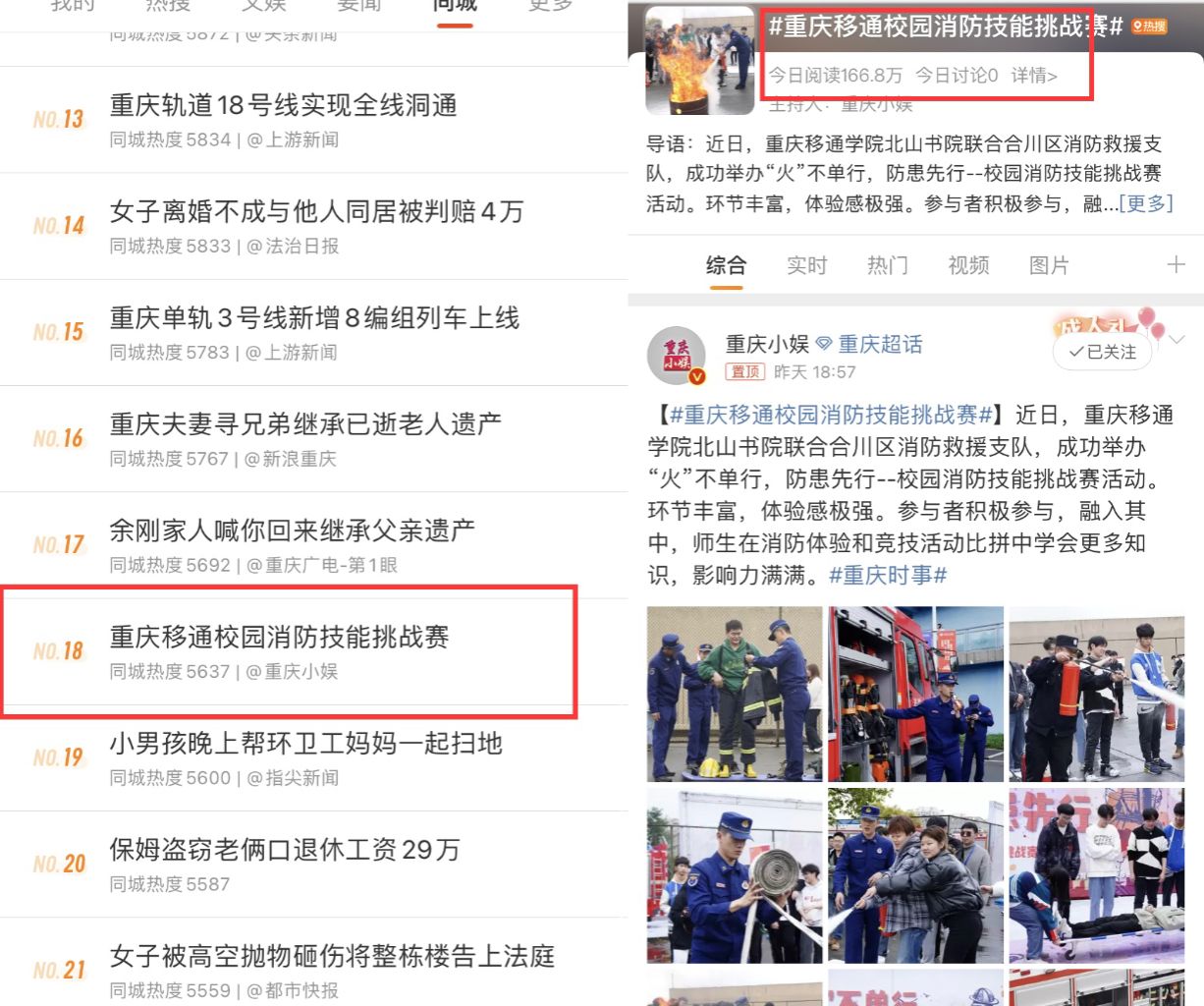 火灾、地震等自然灾害频发,每一场灾难背后,都有许多默默付出的无名英雄,诉说着民众心中的家国情怀,传递着中华儿女的精神信念。为强化移通学子安全教育,提升面临灾害时的自救能力,同时结合书院宿舍一体化建设,特进行防灾减灾宣传教育。3月24日,由重庆移通学院北山书院联合保卫处、学生处、体育活动部、宿管中心同合川区消防救援支队花滩特勤站,成功举办“火”不单行,防患先行--校园消防技能挑战赛活动。活动推出在学校引起热烈反响,当日登上同城热搜,话题浏览阅读量高达116.8万人次,获得一致好评及点赞。