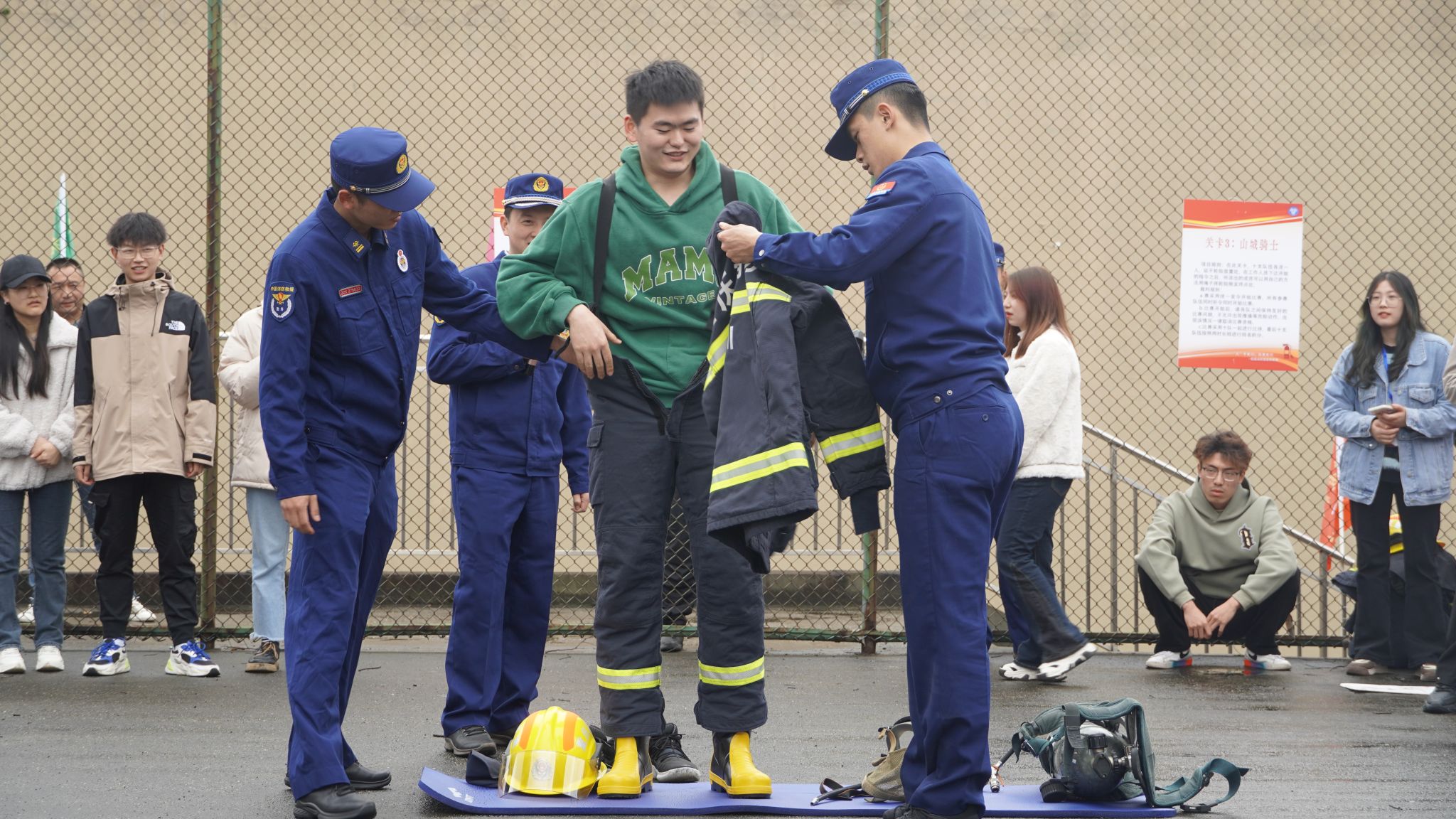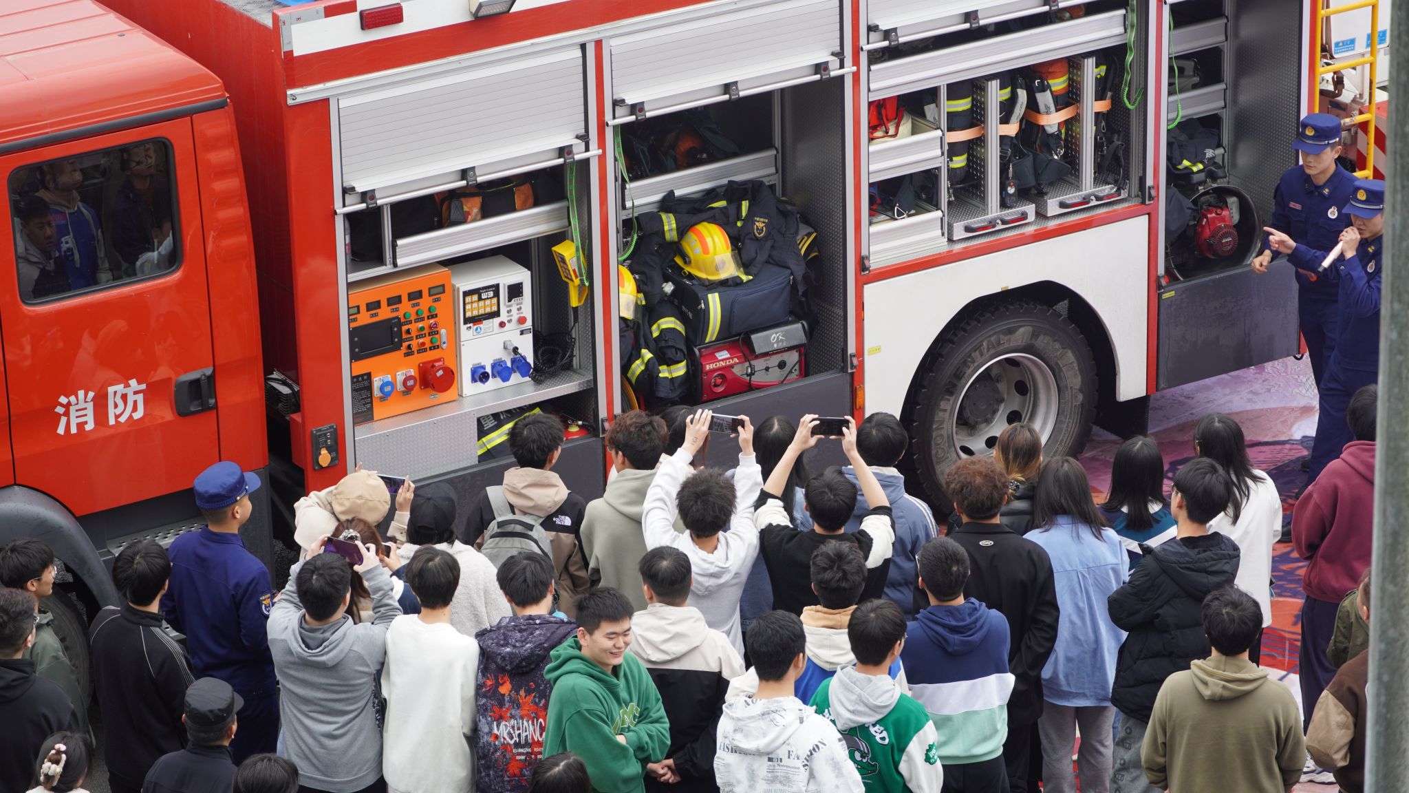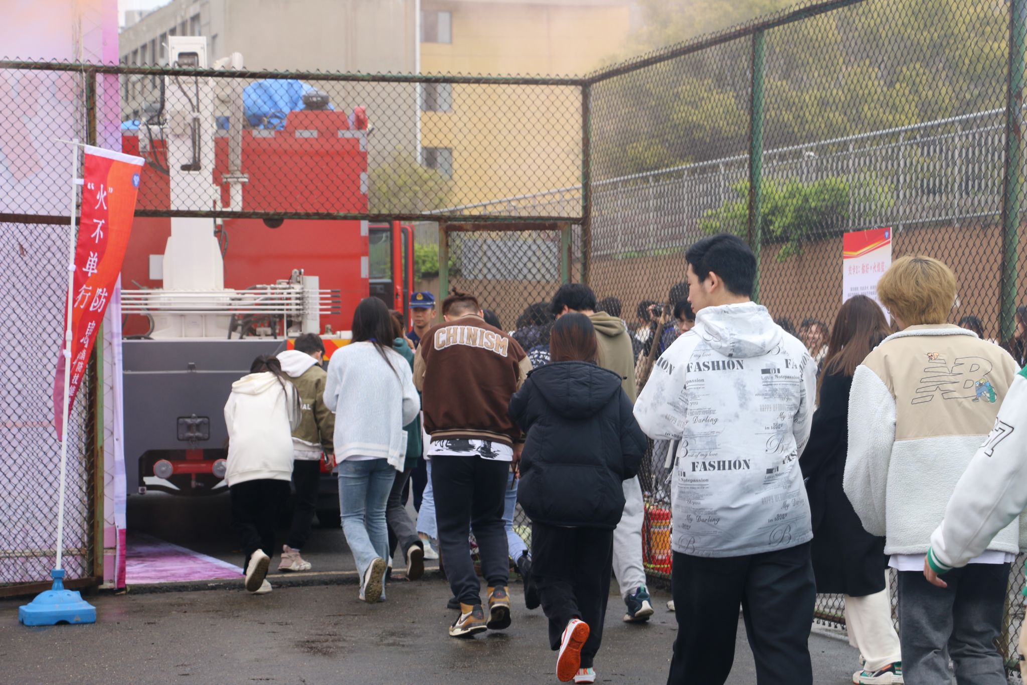 合川消防救援支队花滩特勤站的消防战士进入校园为学子们进行消防知识宣讲、消防车功能讲解,担架救护演练和发烟罐逃生演练,开展“宿舍直通车”消防演练,把帅气“云梯车”请到书院楼下。让学子亲身体验消防用具。随着火灾警报拉响,宿舍消防演习也随之拉开序幕,参与者用湿毛巾捂住口鼻迅速撤离宿舍到达安全区,消防员快速有效地扑灭火源,整个疏散过程急而不乱、稳而有序。