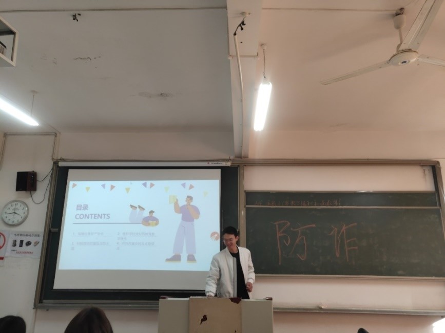 肖遥老师在课前休息时间进行了反诈宣传。肖老师提到要“保证自身财产安全,维护学校良好教学秩序,积极营造反诈骗防火墙,共同打赢全民防诈战”,增强自身的反诈骗意识。