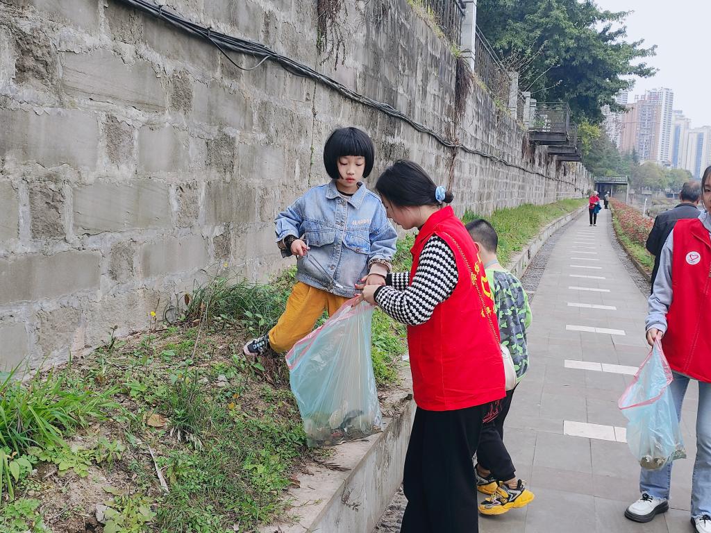 河滩上,志愿者们分工合作、相互配合,12名“河小青”志愿者们身着红色志愿马甲,顶着蓝天白云,沿着河岸不同的方向出发,一手持垃圾钳,一手拿垃圾袋,对河岸垃圾、水上漂浮物、固体废弃物等进行捡拾和清理,小到烟头、塑料袋,大到饮料瓶、打包盒、废旧生活用具都被“收入囊中”。对于一些不能彻底用工具清除的杂物和垃圾,志愿者们则徒手将杂物捞起,集中清理。