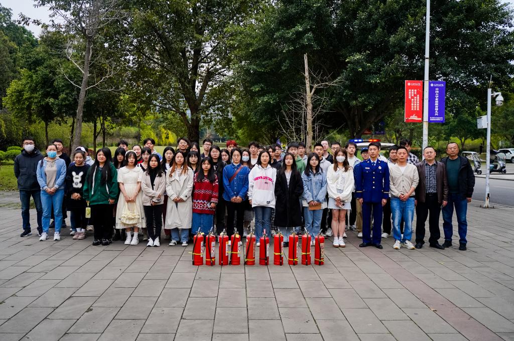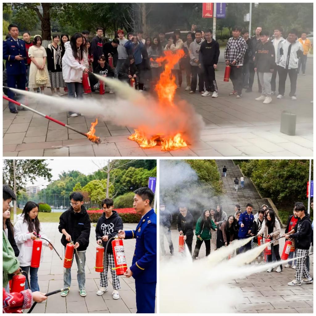 讲座最后,为了让同学们切实学会火灾发生时的逃生与自救,开展了户外的火灾现场演练,李警官详细的讲解火灾逃生方法:信号求救法、毛巾捂鼻法、低身前进法、跳板转移法、迅速撤离法等,并现场演示了灭火器的使用方法,同学们也争先恐后地开始了“灭火行动”,增强了师生的消防意识及灭火技能。