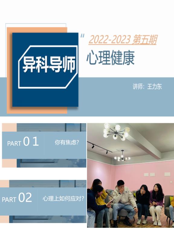 王力东老师与学生一起讨论当下学生们的焦虑,以聆听的方式,关注学生们的心理,同时以游戏互动的方式给与学生们正确的疏导以及相关建议,同学们也积极发言,分享了今天的体验和收获。