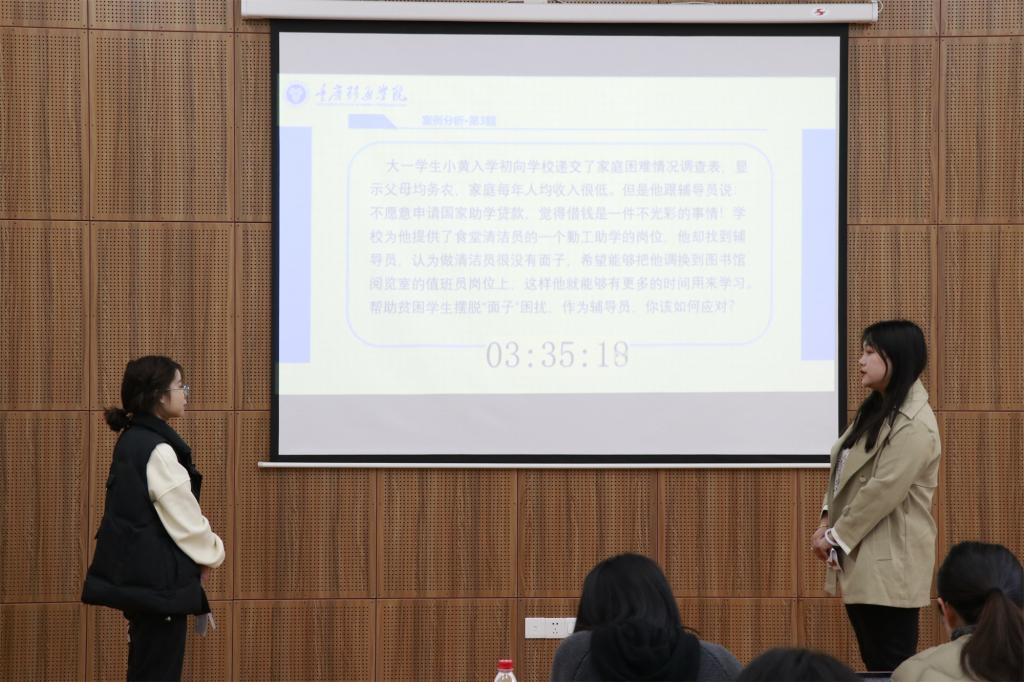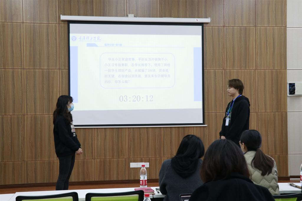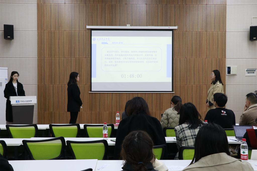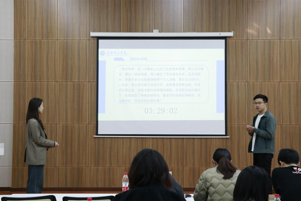 在案例分析环节,比赛通过赛前抽取小组,AB签位,“我提问,你回答”的方式开展,由AB选手围绕案例共同分析问题并以你问我答的方式解决问题。这些案例呈现了大学生日常生活中常遇到的诈骗、权益、生活、感情、安全、心理等各方面的问题,充分地考察了各位辅导员的随机应变能力以及处理实际问题的能力。