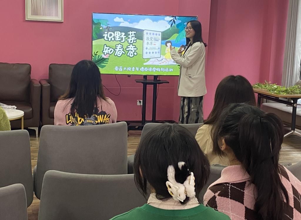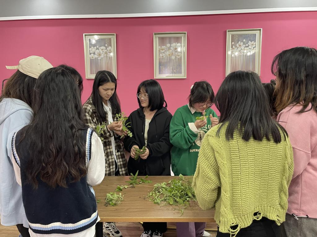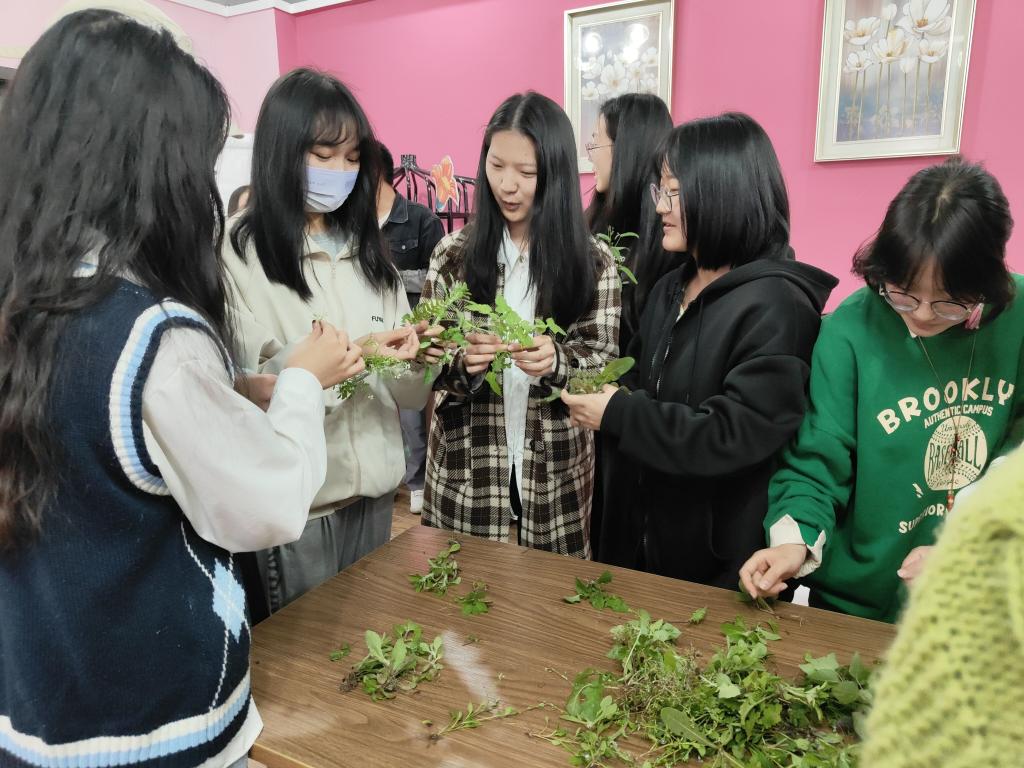 春季是野菜成熟季节,各类野菜从地里冒出来,成为大自然给我们的珍贵礼物。活动伊始,马克思主义学院徐梦笛老师在爱莲书院借助视频、图片给参与本次活动的同学们科普了一部以救荒为宗旨的农学、植物学专著《救荒本草》,书中对一些常见的野生植物资源的利用、加工炮制等方法做了全面的总结,书中记载了大量可食用的野菜、树叶、及植物的根、茎、花、果实、并详细介绍了食用方法。并借助前期与爱莲书院谭开心老师实地考察的经验,给同学们看了田埂上经常出现的马兰头和荠菜等野菜的图片及药用价值,当一切准备就绪,再三嘱咐同学们外出的安全问题后,户外观美列车,正式启动,前往本次活动目的地。