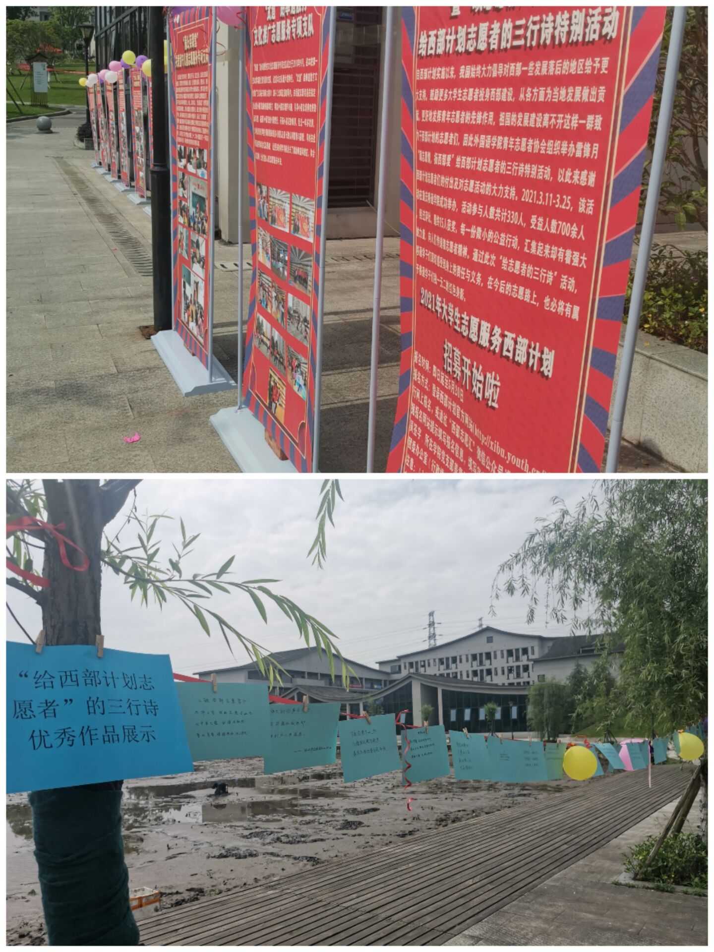 4月21日,通过评委老师们的积极商讨和评选,15名同学的优秀作品脱颖而出,为鼓励获奖学生,同时配合学校“西部计划”的招募宣传,我们将所有获奖作品在天渠书院外的荷花池进行了集中的展示,我院志愿者也对参观的同学进行了西部计划的介绍,特别是对于大四的学长学姐们,志愿者们更是走入天渠书院,宣讲招募流程,点赞志愿故事。