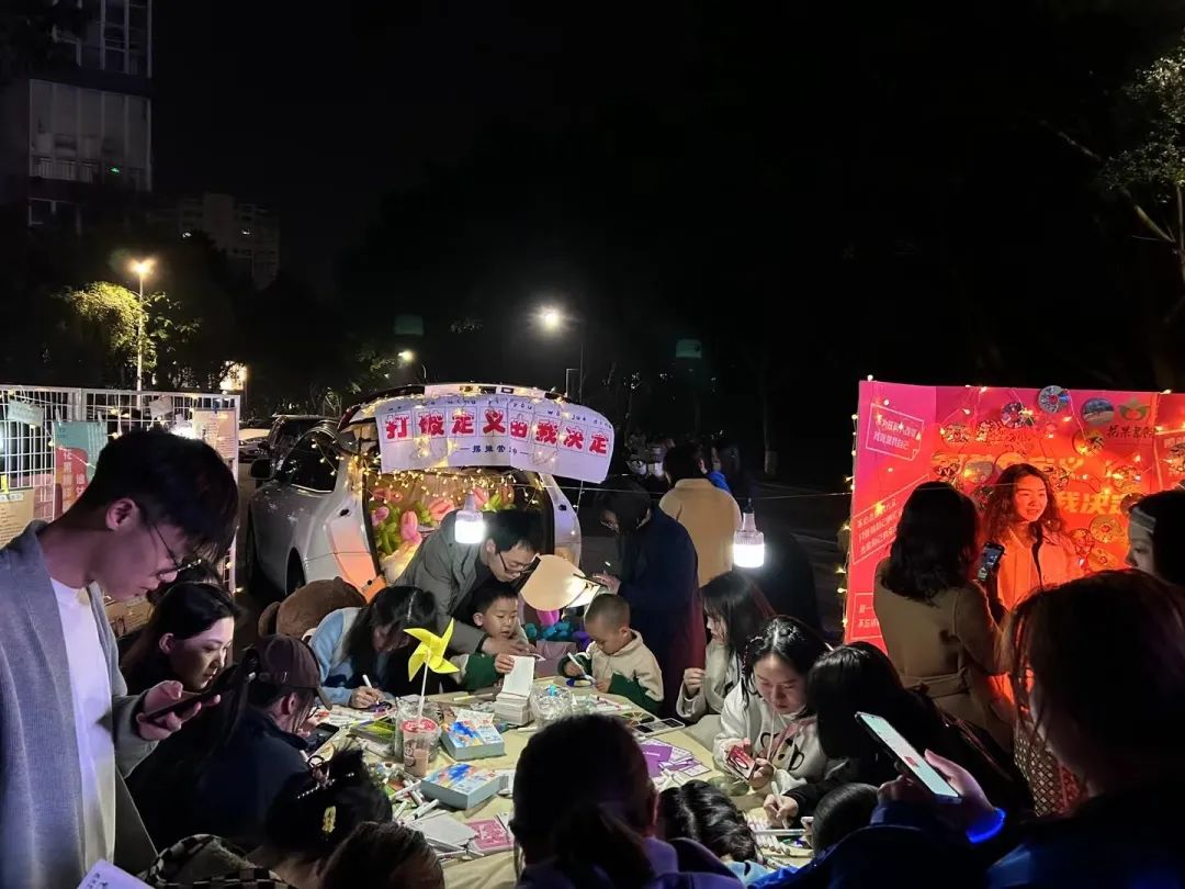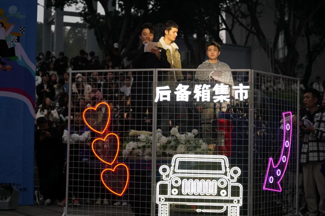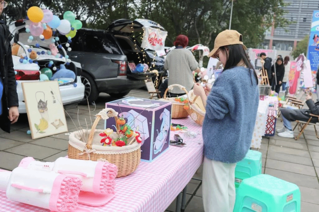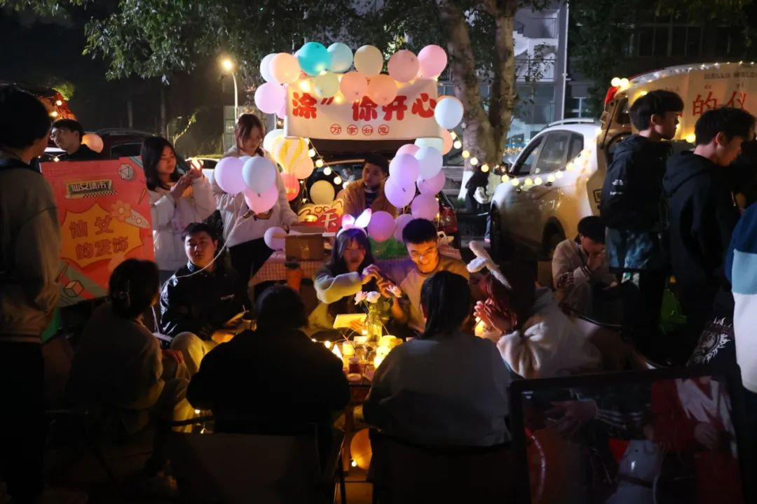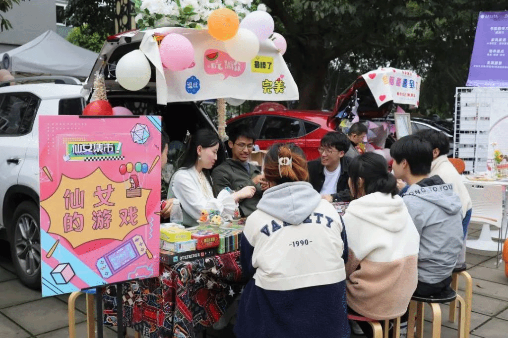 夜幕时分,随着校园灯光的亮起来,一辆辆汽车陆续驶入固定的地点,各自打开后备箱,各学生社团、书院、学院等“摊主”串上一串串打造氛围的串灯,支起招牌,开始展示社团、书院文化、布置互动摊位,甚至还摆上了网红饰品、蛋糕、鲜花等各类自制物品。
