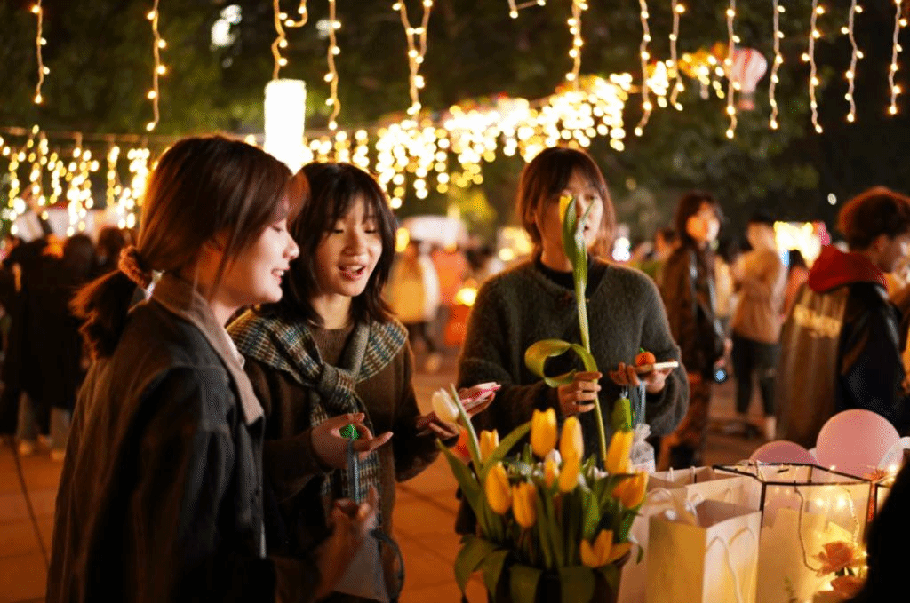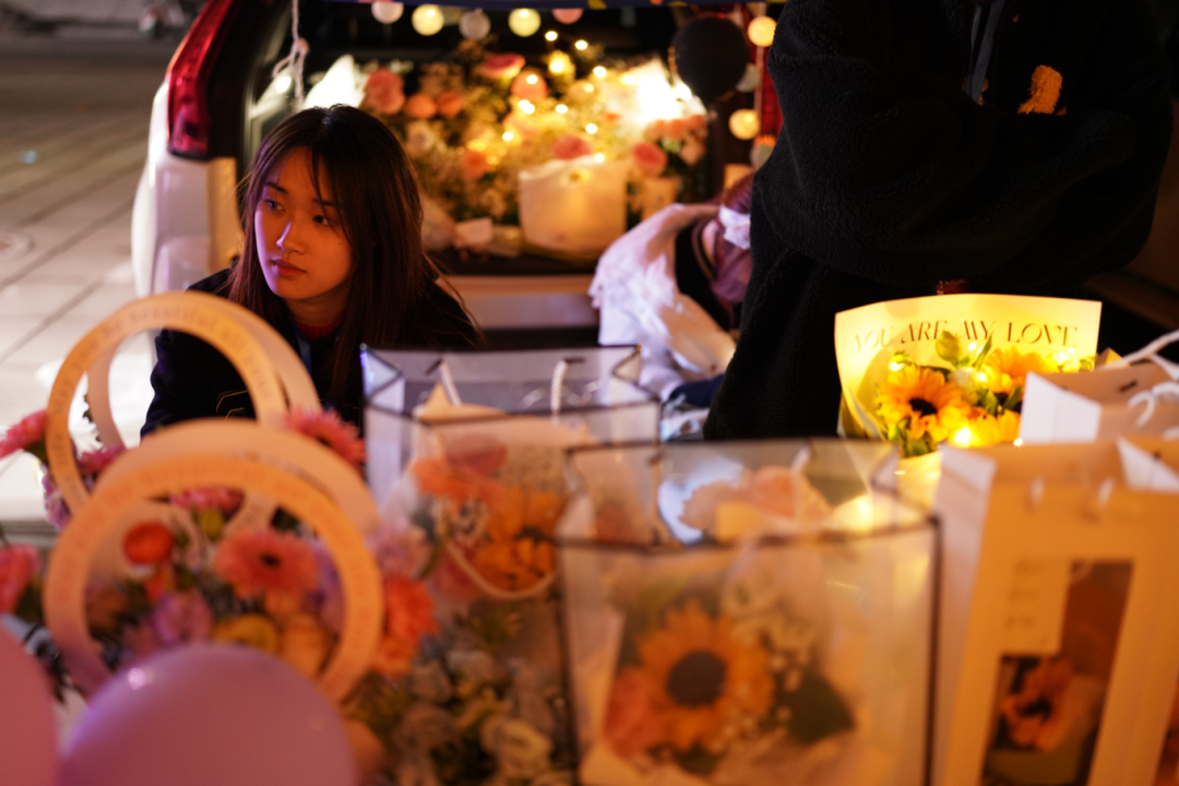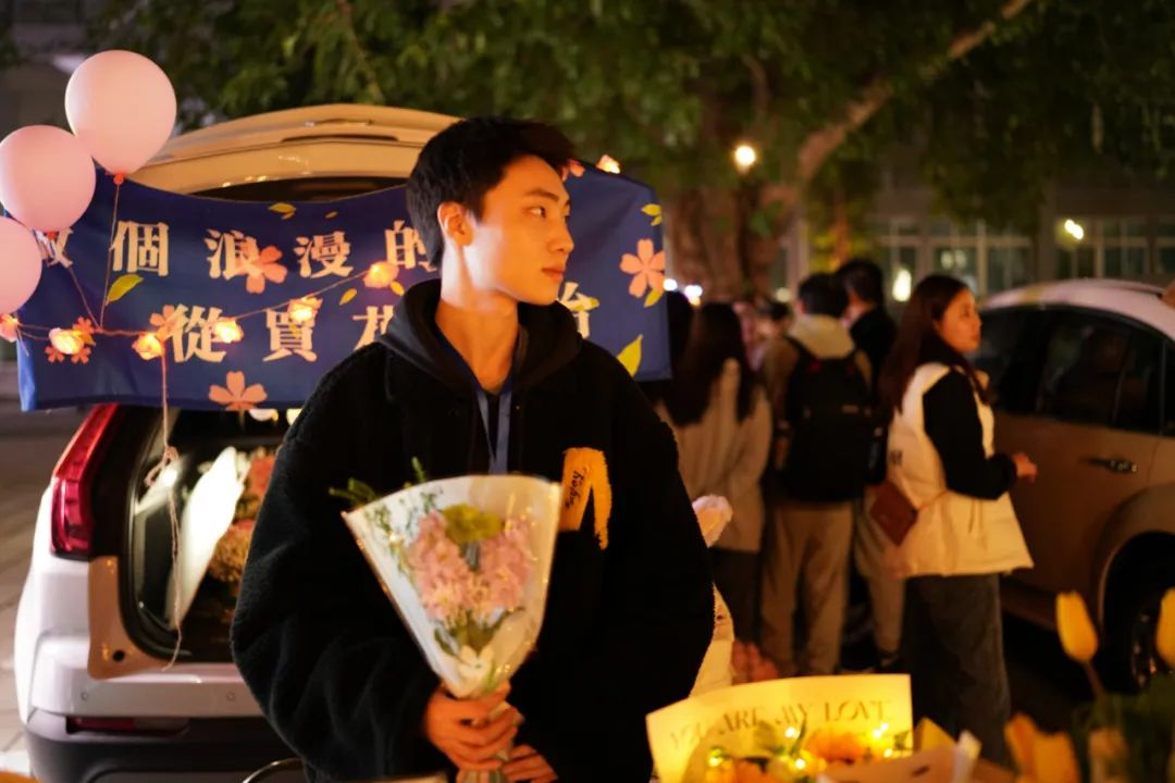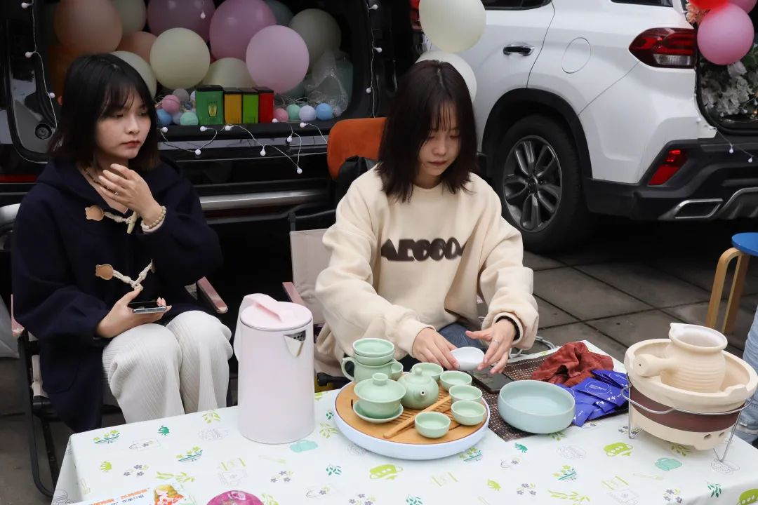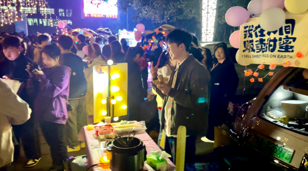 夜幕时分,随着校园灯光的亮起来,一辆辆汽车陆续驶入固定的地点,各自打开后备箱,各学生社团、书院、学院等“摊主”串上一串串打造氛围的串灯,支起招牌,开始展示社团、书院文化、布置互动摊位,甚至还摆上了网红饰品、蛋糕、鲜花等各类自制物品。