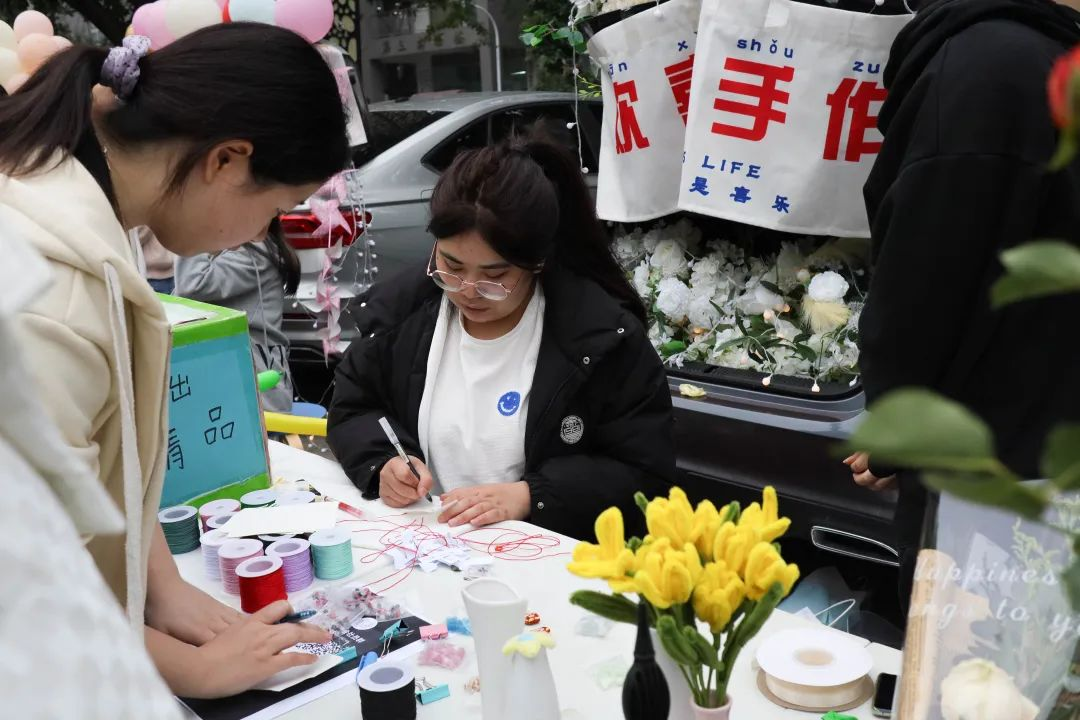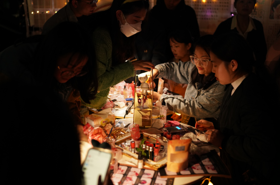 当然,今晚集市的互动感也十足,设计了超过18个手工制作类社团、基层班团、书院的“后备箱摊位”,类型囊括手工艺品、创意造物,有些作品经过前期社团等学生制作展示,而更多的是现场给你们一些有趣的体验,比如现场DIY石膏娃娃、帆布包DIY、发饰DIY、插花艺术、桌游体验、茶艺表演等等。