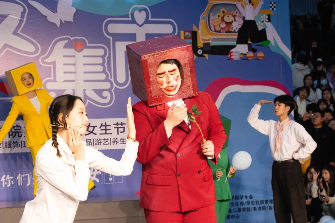 在快闪环节中,2022年乌镇国际戏剧节古镇嘉年华单元入围作品——《脑海中的红绿灯》在现场进行了首次表演,其中“女生节”彩蛋的改编,是给今年女生节的一份礼物,更是一份惊喜。同时,中国新商科大学集团联席董事长彭鸿斌博士来到仙女集市观看该话剧,与现场学生亲切互动。