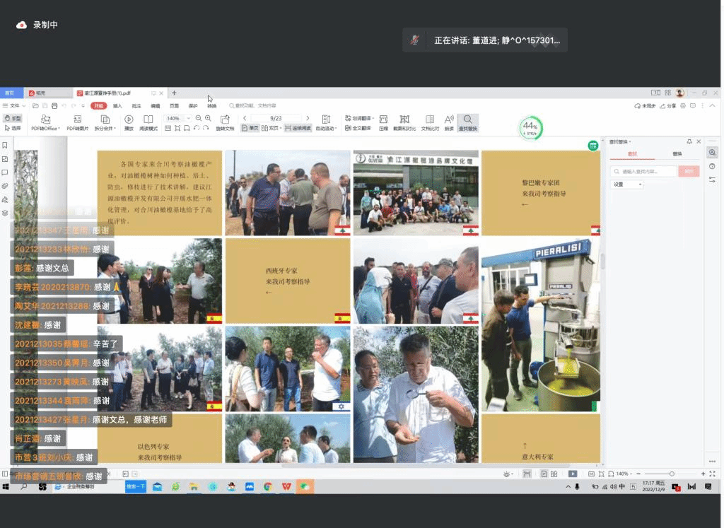 在同学们的热情欢迎下,文总首先介绍了企业整体情况。从橄榄油的历史到种植,到企业脱贫工作的“企业+合作社+农户”新模式的运行,从公司的发展历程到行业的愿景展望,都无不体现出渝江源企业的赤诚情怀和励志为中国人打造属于自己的“健康,安全,放心”油的坚定决心。正如文总所说“做企业我们要低头看脚下,踏踏实实走好每一步,同时我们也要抬起头,展望未来,永远赤诚。”紧接着,文总分别从产品策略、价格策略、渠道策划和促销策略4大方面介绍了企业目前的经营现状。目前,渝江源投放在市场上的有80%成熟度、90%成熟度以及100%成熟度橄榄油。国产橄榄油价格昂贵的主要原因是与国外制作工序不同,中国企业采用的全是鲜果种植,人工采摘,虽然出油率低,但极大程度保证了橄榄油的健康和口感。其中,文总还十分热情地介绍了渝江源3万亩橄榄果园,并计划2024年将橄榄果园扩面到5万亩,2027年扩面到10万亩,同学们听后都纷纷表示有机会想线下去参观学习。之后,文总还详细地介绍了橄榄油的用法和功能,并对目前的销售模式和促销方式进行了介绍。公司主要集中于团购分销以及KA卖场的销售渠道模式,但近几年受疫情影响,正准备大力发展线上直营模式,也表示未来企业会将重心放在成都和深圳,努力进行渠道开拓。另外,考虑到橄榄油具有美容功能,公司还打算将其作为化妆品的原料供应商。通过文总的讲解,同学们对渝江源企业、对橄榄油本身的了解也越真实、详细。