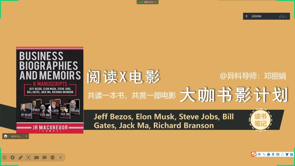 在此次分享会开始之前,同学们已经按照要求各自阅读完《Business Biographies And Memoirs》一书,本书以6位经营管理成功人士的自传与传记为核心内容,向读者展示了大咖们的创造能力与敏捷的思维力,其中包含大家所熟知的阿里巴巴集团主要创始人马云、苹果公司联合创办人史蒂夫·乔布斯、亚马逊的创始人和首席执行官杰夫·贝佐斯等6位成功人士。