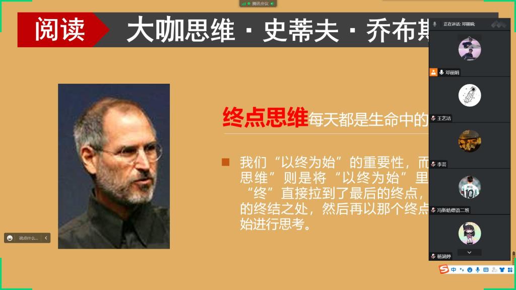 在聆听同学们精彩的分享后,邓老师以史蒂夫·乔布斯为例分享了自己的一些见解。首先,邓老师分析了乔布斯身上所蕴含的“大咖思维”,解读了乔布斯的终点思维、跨界思维、战略思维和升维思维的模式及特点。接着,她通过案例深度解读了各种思维模式对同学们的受用之处,邓老师表示,未来四年,同学们应跳脱书本中的禁锢思维,以书本为基础,以实践为导向,两者结合在一起去开拓我们的眼界,同时紧密结合学校“四位一体”的育人理念,在完满活动中找寻到适合自己方向,以此收获、成就自己,而不是盲目的陷入“唯分数论”,为了分数随意参与自己不感兴趣的活动。