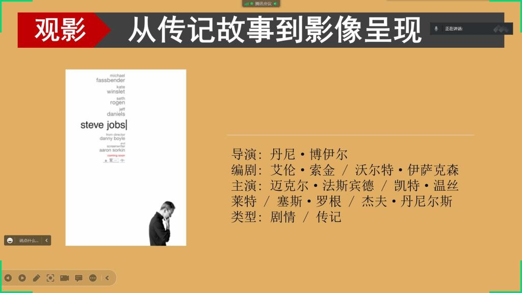 我们从乔布斯的传记故事中看到了他的思维模式、营商技巧,从文字到影像,我们又会看到一个怎么样的乔布斯呢?电影又会如何改编这样一个故去的人呢?带着这样一个疑惑,邓老师与同学们共同观赏电影《史蒂夫·乔布斯》,影片聚焦乔布斯生前三件关键性产品的发布时刻,为观众塑造了一个从其他视野认识乔布斯的机会。